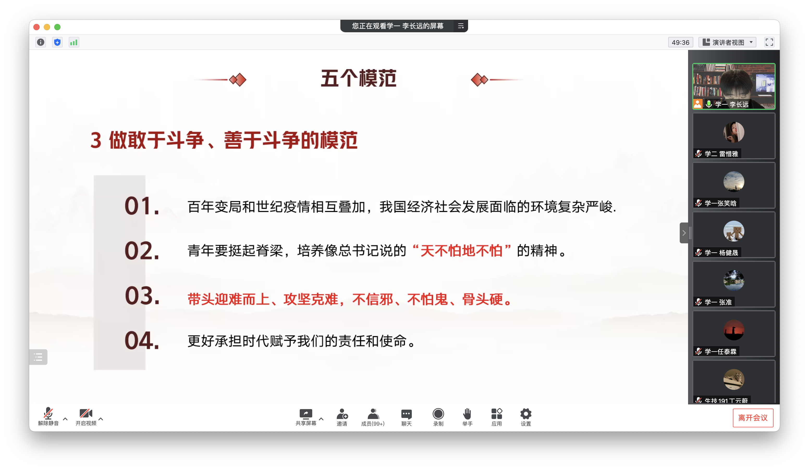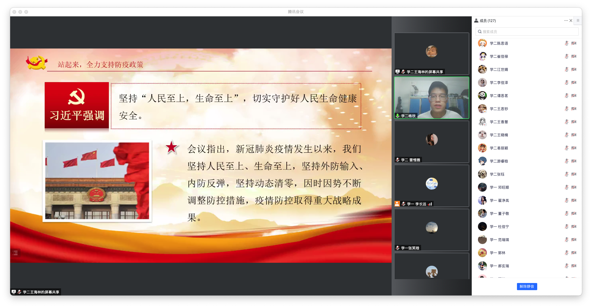 会议上,学生第二党支部的杨欣同志结合5月5日中共中央政治局常务委员会召开的分析当前新冠肺炎疫情防控形势,研究部署抓紧抓实疫情防控重点工作的会议,分享了主题课程《筑堡垒,做先锋,当榜样》。提醒支部同志决不能躺平,要“站”起来,积极支持响应国家的防疫政策;要行动起来,坚定必胜信念,扛起防控责任;要积极践行入党誓词,做一个在“平常时候看得出来,关键时刻站得出来,危难关头豁得出来”的优秀党员!
