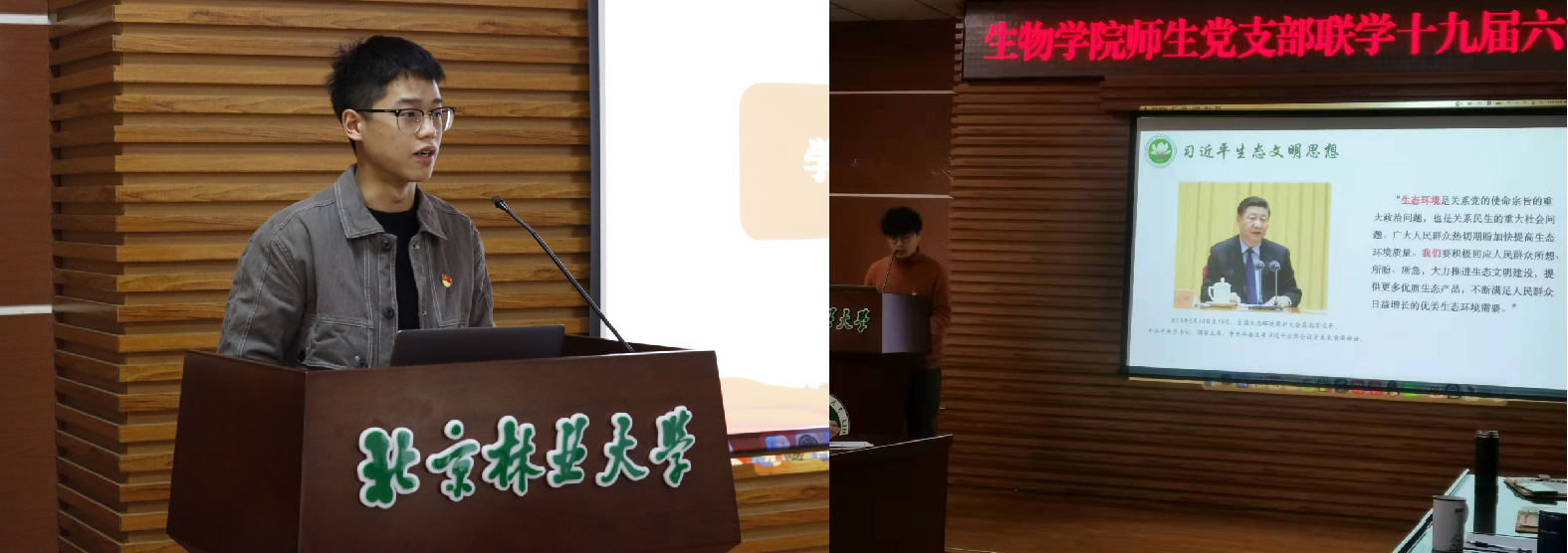 在党支部微党课环节,本科生学一党支部代表李长远结合暑期社会实践,进行了微党课分享,根据所见、所闻讲述了他所理解的毛白杨精神以及作为北林学生应有的担当。学二党支部代表杨欣通过微党课分享了从学习党的百年奋斗经验中汲取智慧,并运用于学生党支部建设的实际做法。