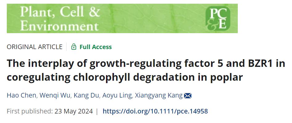 近日,北京林业大学生物科学与技术学院康向阳教授团队在杨树叶片叶绿素降解分子调控机制方面取得了重要进展。研究成果以题为"The interplay of growth-regulating factor 5 and BZR1 in coregulating chlorophyll degradation in poplar"的论文,发表在生物学一区TOP期刊《Plant, Cell & Environment》上,揭示了GRF5和BZR1在杨树叶绿素降解中的协同作用机制等。