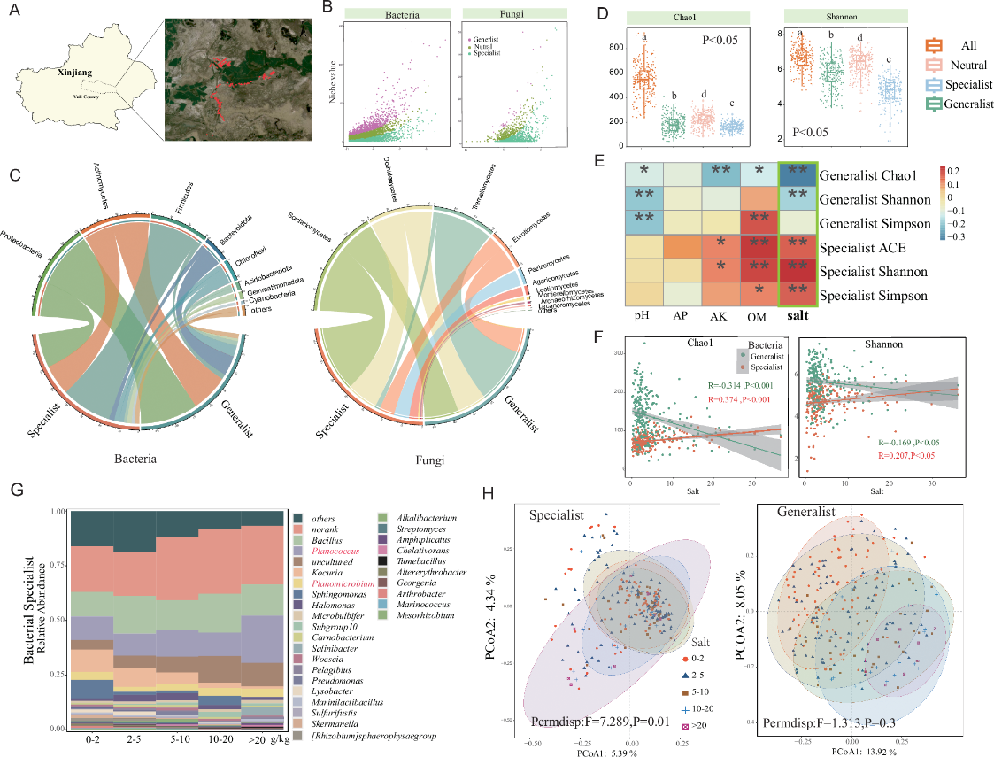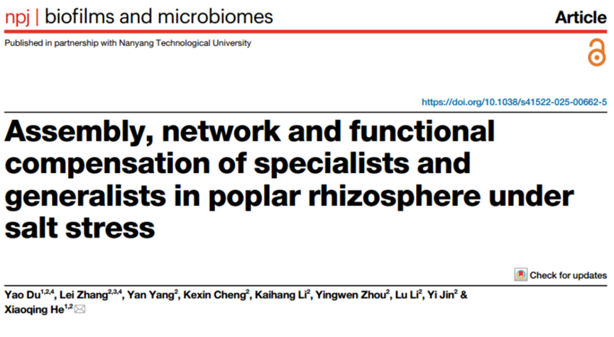近日,北京林业大学生物科学与技术学院何晓青教授团队在盐碱胁迫下胡杨根际微生物组领域取得了新进展。研究成果以题为"Assembly, network and functionalcompensation of specialists andgeneralists in poplar rhizosphere undersalt stress"的论文,发表在Nature出版集团旗下的知名刊物《npj biofilms and microbiomes 》(中科院1区,Top期刊)上。该研究揭示了胡杨根际特化种和泛化种的多样性模式、组装机制、网络特征以及功能补偿机制。