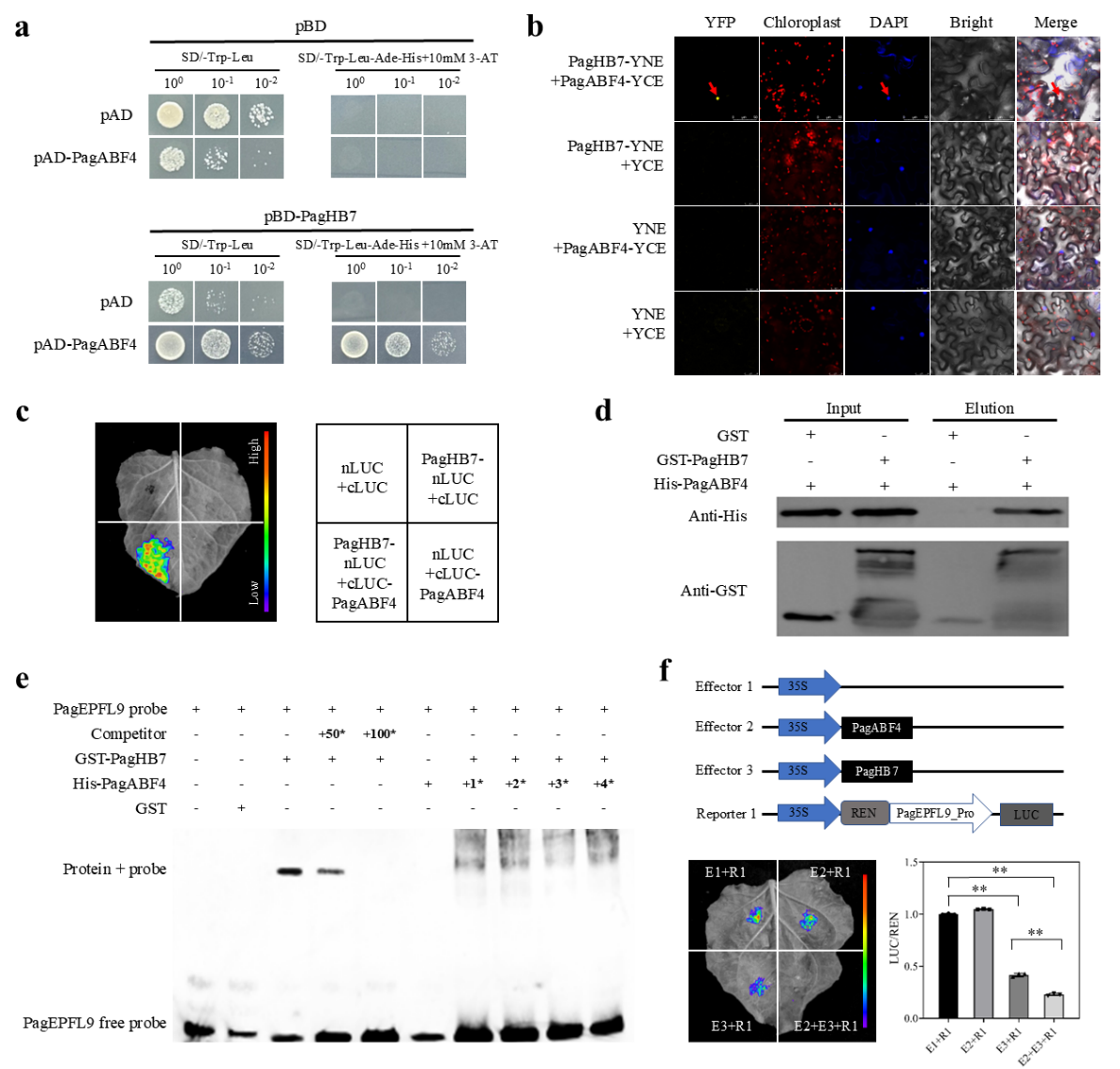 图 2 PagHB7 与 PagABF4 蛋白相互作用并增强其对 PagEPFL9 表达的抑制