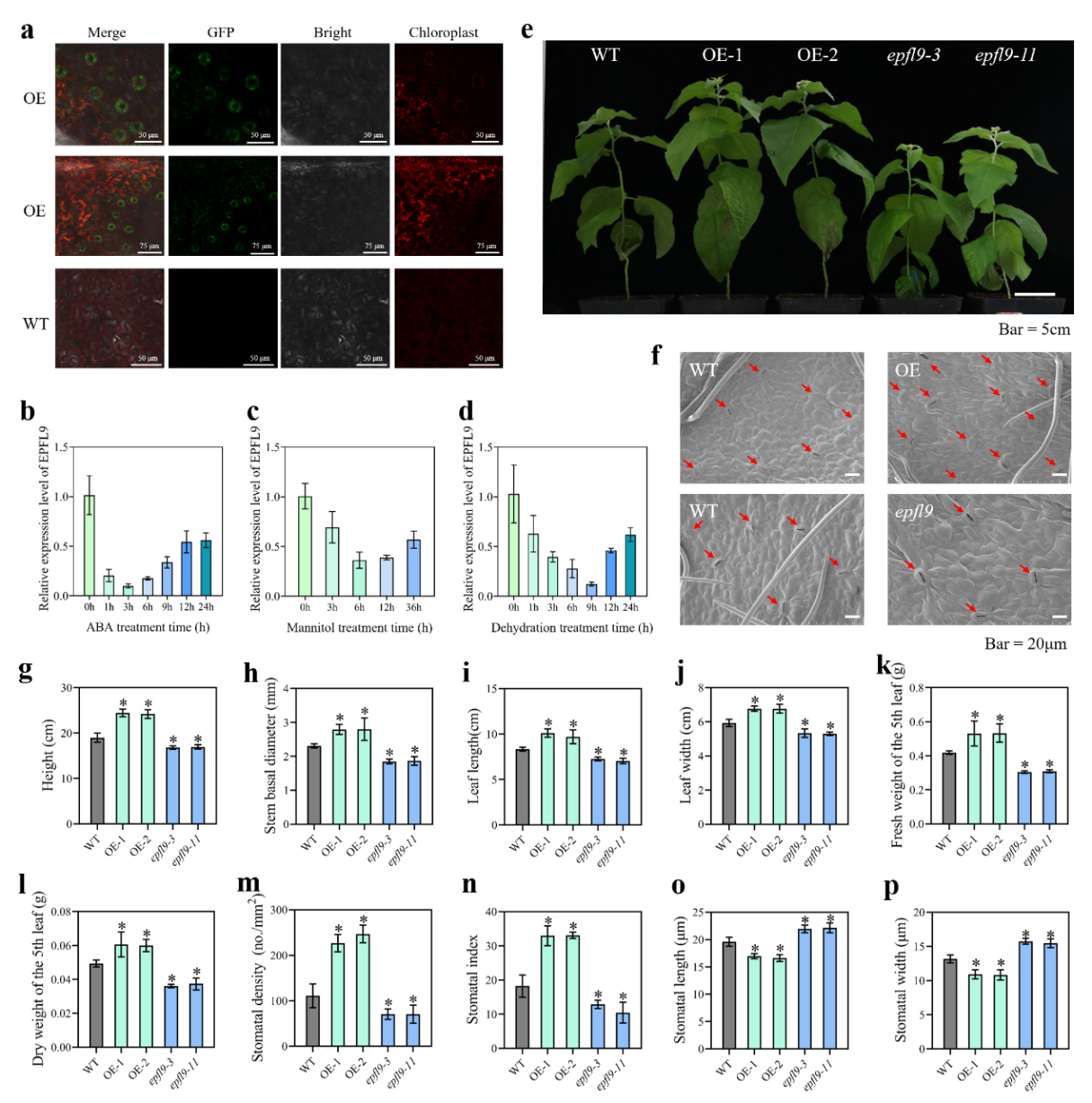 该研究发现过表达PagEPFL9杨树(OE)与WT相比具有生长优势,其株高和基径均大于WT,气孔密度和气孔指数显著高于WT,而PagEPFL9基因敲除植株(epfl9)则表现出相反的变化趋势。对WT、OE和epfl9株系进行干旱胁迫处理实验结果表明,干旱胁迫处理后,OE植株的细胞膜受损更严重,抗旱性降低,而敲除PagEPFL9植株则抗旱性更强。