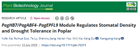 近日,Plant Biotechnology Journal 杂志在线发表了北京林业大学康向阳课题组题为“PagHB7/PagABF4–PagEPFL9 module regulates stomatal density and drought tolerance in poplar”的研究论文。该研究揭示了PagHB7和PagABF4互作并通过靶向PagEPFL9调控杨树气孔密度和抗旱性的分子机制,为植物生长和抗旱性分子设计育种提供了新的遗传资源。