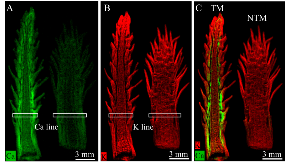 图1 μ-XRF揭示钙在玉兰雌蕊柱外侧组织的显著富集