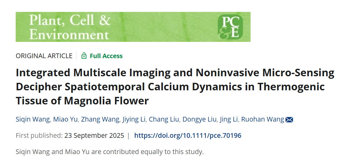 春寒料峭时,玉兰花竟能悄悄“发热”?这看似童话般的现象,实则蕴含着植物应对低温,保障繁殖的生存智慧。近日,北京林业大学王若涵教授团队在植物学权威期刊《Plant, Cell & Environment》(一区,Top期刊)在线发表题为Integrated Multiscale Imaging and Non-invasive Micro-sensing Decipher Spatiotemporal Calcium Dynamics in Thermogenic Tissue of Magnolia Flower的研究成果,通过多尺度成像与非损伤微测技术的创新融合,首次精准定位玉兰花核心产热区,并揭示钙离子调控产热的关键机制,成功突破木本植物生热研究的长期瓶颈,为该领域奠定了关键方法与体系基础。