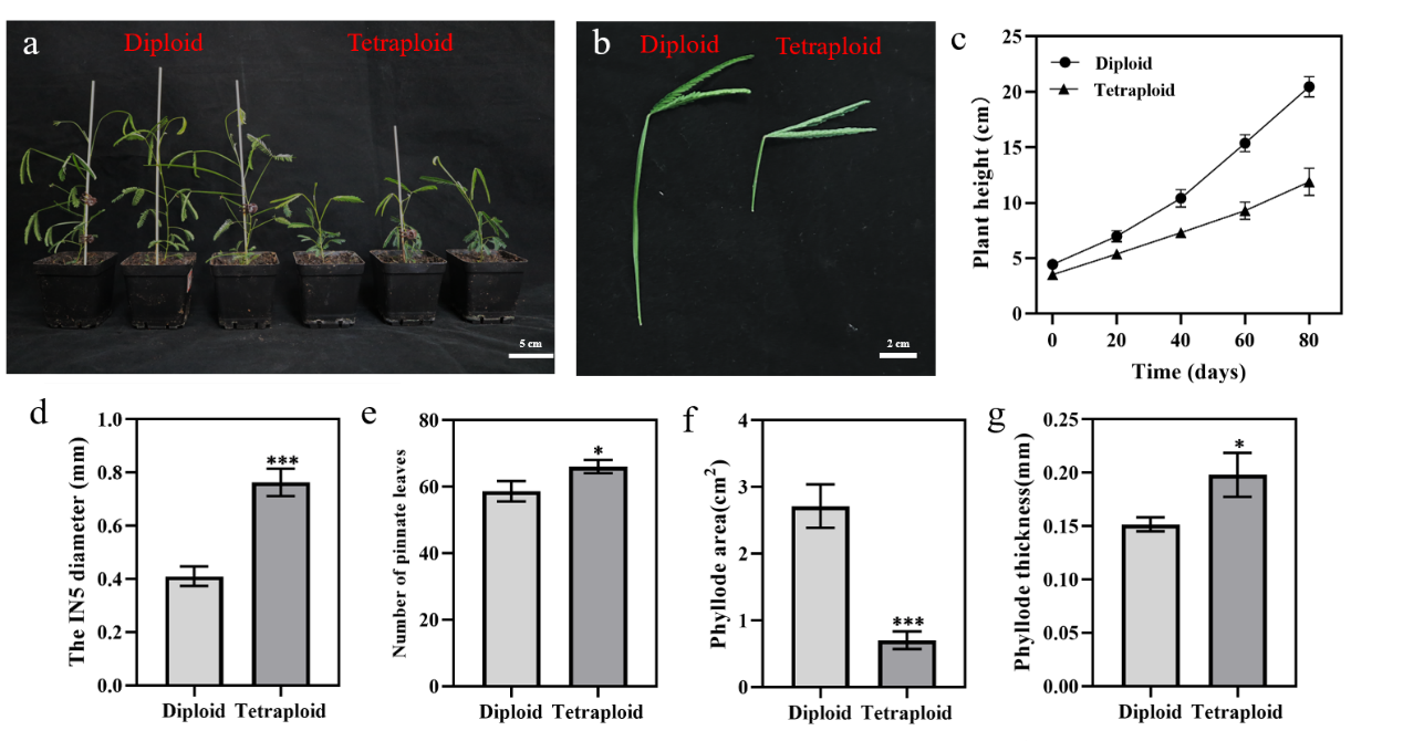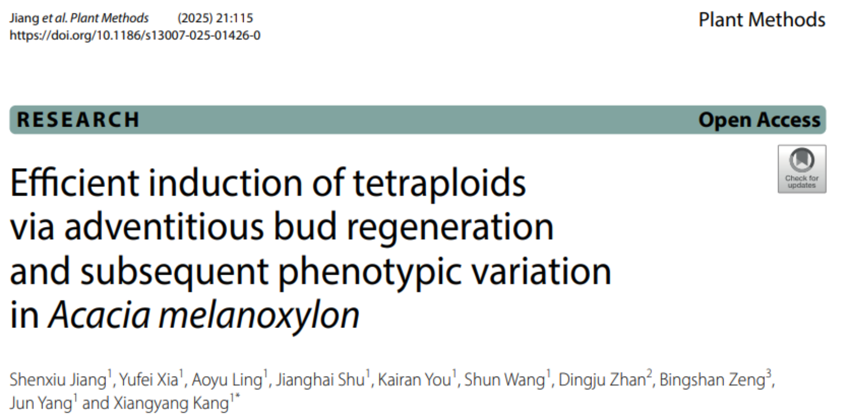 2025年8月22日,北京林业大学生物科学与技术学院康向阳课题组在Plant Methods杂志在线发表了题为“Efficient induction of tetraploids via adventitious bud regeneration and subsequent phenotypic variation in Acacia melanoxylon”的研究论文。该研究提出了一种基于带芽茎段培养不定芽发生途径高效诱导体细胞染色体加倍获得黑木相思四倍体的方法,并于世界上首次获得了黑木相思四倍体新种质。
