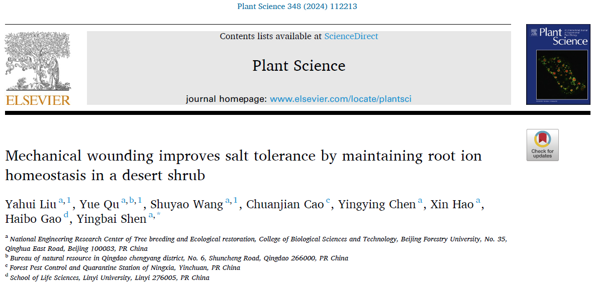 近日,我院沈应柏教授团队在《Plant Science》上发表了题为“Mechanical wounding improves salt tolerance by maintaining root ion homeostasis in a desert shrub”的研究论文。