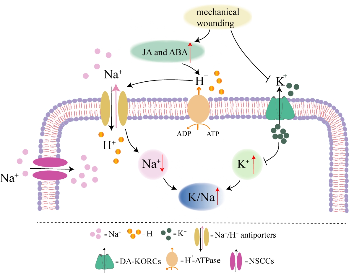机械损伤预处理通过激活茉莉酸和脱落酸的生物合成,增强了H+-ATPase活性,促使H+排出细胞,形成跨膜电化学势梯度,进而激活Na+/H+逆向转运体,有效排出细胞内的Na+,减少细胞中Na+含量。同时,机械损伤预处理减少了K+的流失,保持细胞内较高的K+含量,提高了K/Na值,维持细胞离子稳态。同时,机械损伤预处理还提高了沙冬青的抗氧化酶活性和渗透调节物质的含量,与细胞内离子共同作用,缓解了盐胁迫引起的水分损失和生长抑制,最终提高了沙冬青耐盐性。