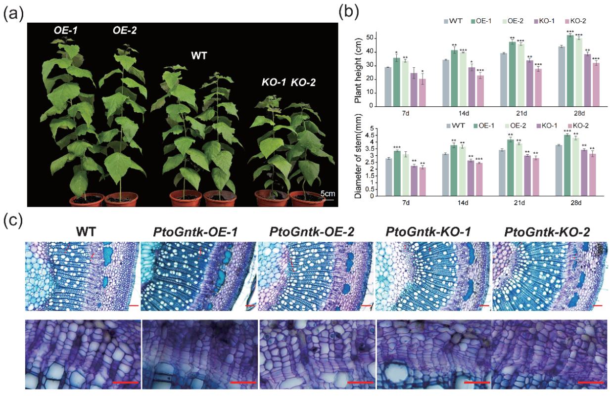 图3 遗传转化证明PtoGntK正调控杨树生长