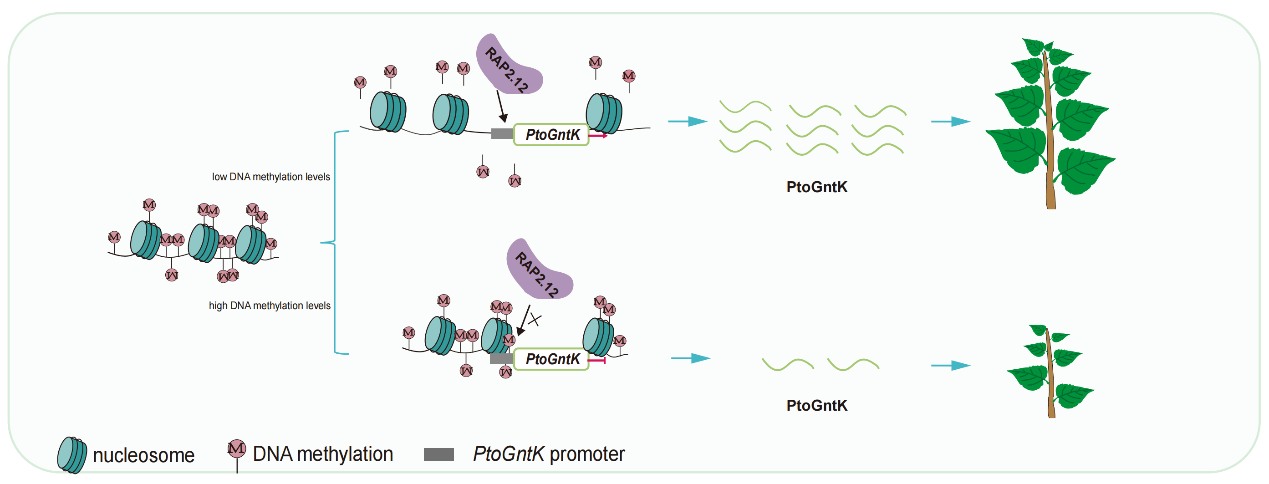 本研究中,团队人员鉴定到表观调控的杨树生长关键基因PtoGntK,在启动子区域处于低DNA甲基化水平时,染色质具有更高的可及性,为转录因子结合提供空间,使其更容易被上游转录因子PtoRAP2.12激活,促进植物生长(图4)。本研究探讨了DNA甲基化在植物生长中的作用,并阐明了“DNA甲基化-染色质可及性-关键生长基因”的表观遗传调控机制,研究为木本植物生长发育提供了新的思路。