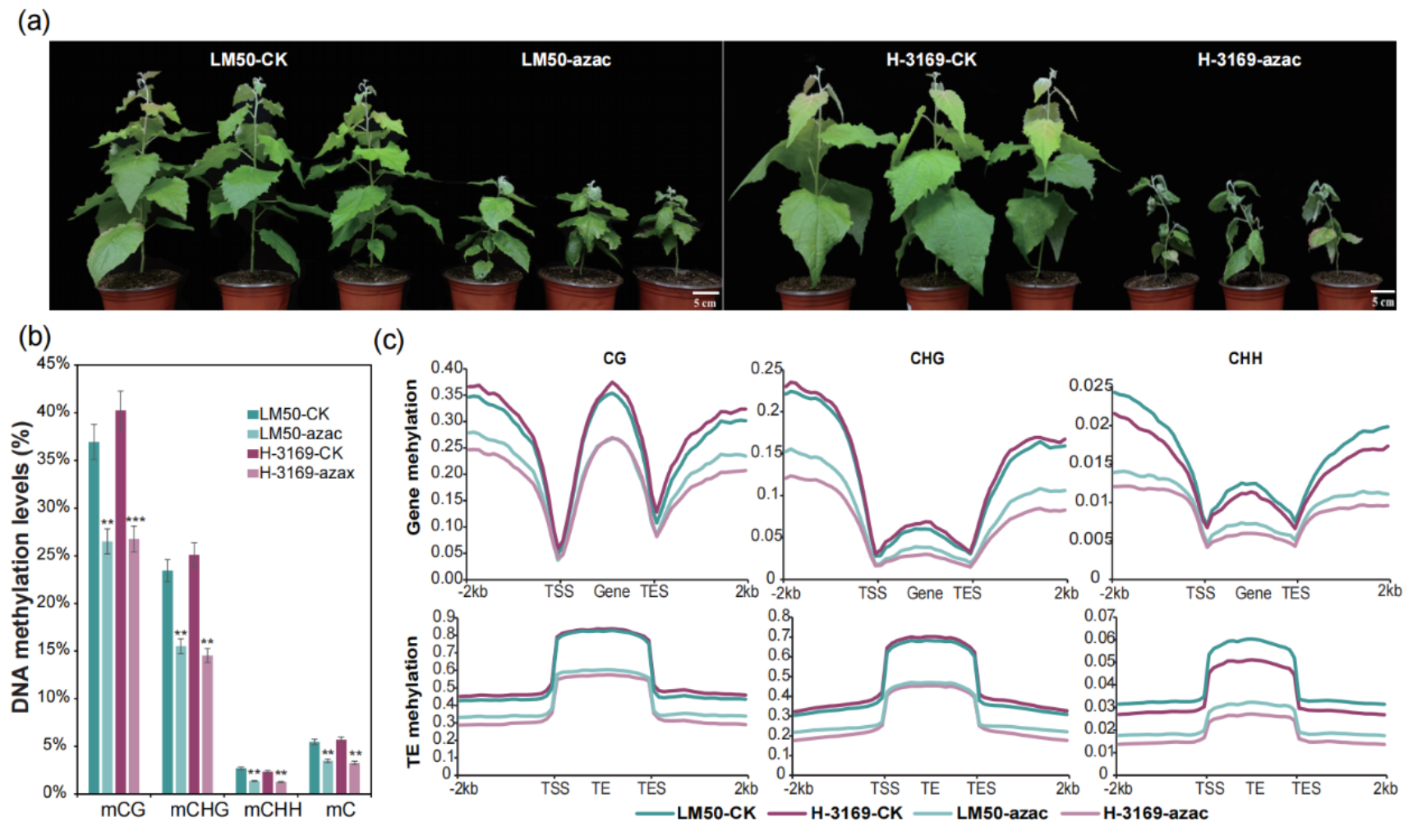 该研究以两个优良毛白杨种质“LM50”和”H-3169”为材料,对其进行DNA甲基转移酶抑制剂5-AzaC处理,处理后的毛白杨植株DNA甲基化水平显著下降,植株生长受到明显抑制,表明DNA甲基化对植物生长至关重要(图1)。·