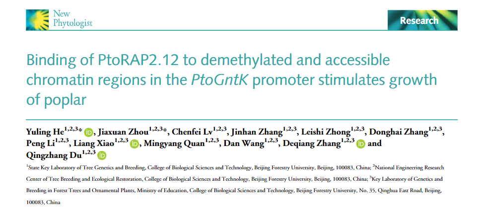 DNA甲基化作为重要的表观遗传修饰,参与基因转录调控、基因组稳定、染色体互作等广泛的生物过程。研究表明,DNA甲基化在植物的生长发育和响应逆境胁迫中发挥着重要作用,然而,DNA甲基化影响染色质开放性进而调控植物生长发育的作用机制尚不清晰。近日,北京林业大学生物科学与技术学院/林木遗传育种全国重点实验室杜庆章教授课题组在New Phytologist在线发表了题为“Binding of PtoRAP2.12 to Demethylated and Accessible Chromatin Regions in the PtoGntK Promoter Stimulates Growth of Poplar”的研究论文,揭示了DNA甲基化可通过影响染色质开放性调控转录因子PtoRAP2.12与杨树生长相关基因PtoGntK的结合能力,从而调控植物生长的表观调控机制。