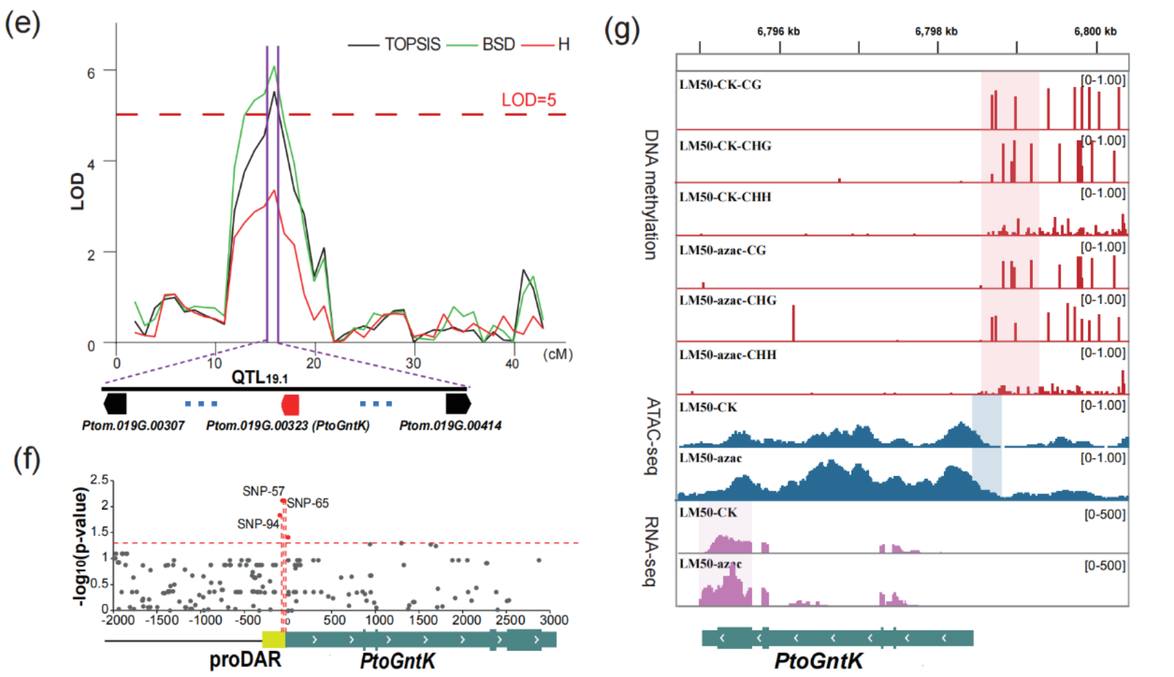 基于毛白杨自然群体表观基因组关联分析(EWAS)策略,在112个候选基因中鉴定到61个基因内含有表达量相关的单甲基化多态性位点(SMPs),有66个基因含有生长表型相关的SMPs。进一步联合连锁—连锁不平衡作图策略,定位了47个与生长显著相关的QTLs,其中,主效QTL19.1包含有一个低甲基化-高开放性-差异表达候选基因PtoGntK (图2),表明该基因受DNA甲基化与染色开放性调控且与植物生长密切相关。
