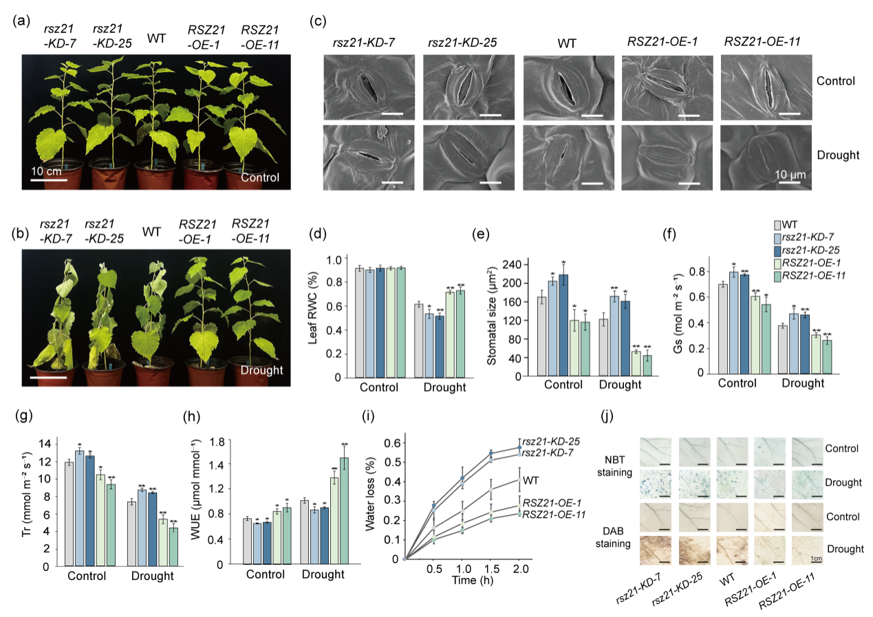 为进一步揭示全基因组稀有变异对非生物胁迫的综合遗传效应,研究人员分别利用全基因组常见和稀有SNP变异对毛白杨自然群体气孔性状进行了遗传力分析。研究结果发现常见和稀有SNP共同解释的遗传力超过了单独利用常见SNP估计的遗传力,证实了稀有变异对气孔性状遗传力的贡献。联合利用4种稀有变异全基因组关联分析方法,精准定位到75个与气孔大小和密度显著相关的候选基因,结合杂交群体的eQTN定位,最终确定了富含丝氨酸精氨酸的剪切因子PtoRSZ21作为影响杨树气孔大小和抗旱性的候选基因。过表达和RNAi介导的PtoRSZ21转基因株系气孔及抗旱性明显改变,验证了PtoRSZ21在调控气孔大小和耐旱性的作用(图2)。