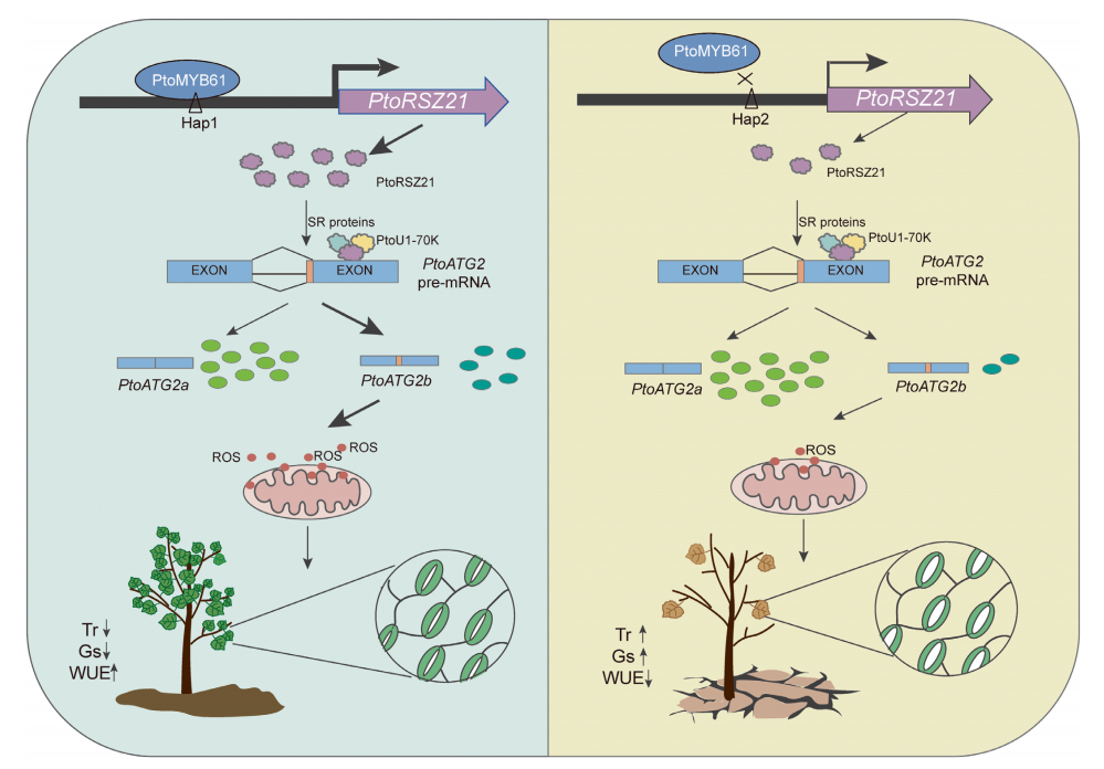 为进一步解析PtoRSZ21调控气孔大小和耐旱性的分子机制,研究人员进行了可变剪切分析以及一系列分子生物学实验创新,证明了PtoRSZ21作为剪接体的潜在组分,通过与核心剪接因子PtoU1-70K及其他SR蛋白相互作用,调控自噬相关基因PtoATG2的可变剪切。这导致抗旱剪切变体PtoATG2b的增加和过量的ROS积累,从而影响气孔大小和耐旱性。进一步序列分析发现PtoRSZ21启动子区存在两种单倍型(PtoRSZ21hap1和PtoRSZ21hap2)与干旱适应相关,携带PtoRSZ21hap2稀有单倍型的个体显著降低了气孔调节因子PtoMYB61的结合亲和力,最终导致PtoRSZ21的表达水平下降和抗旱性的降低(图3)。本研究为杨树可变剪切影响的耐旱性响应机制提供了见解,验证挖掘的主效基因及稀有变异将进一步推动抗逆杨树品种分子设计育种工作,加快我国林木现代育种进程,提升国际同领域科技竞争力。
