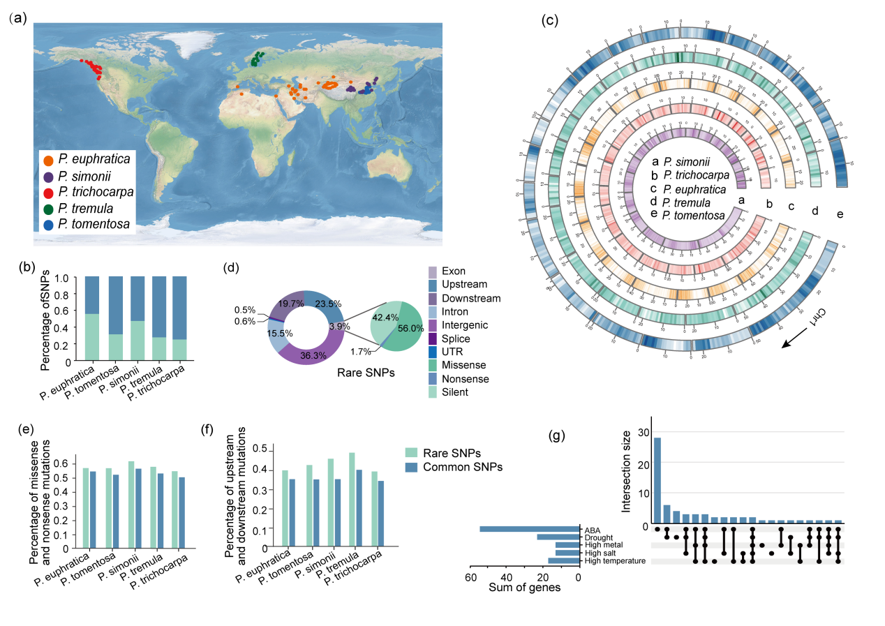 研究表明,多年生林木物种与经历了重复人工选择的作物不同,群体进化速率低、有效种群规模大,限制了随机遗传漂变导致的等位基因丢失,保留了更高比例的稀有遗传多态性。事实上,由于纯化选择的长期影响,木本植物稀有遗传变异会持续存在,并且比作物更有可能在决定复杂性状方面扮演关键角色。然而,当前,木本植物全基因组稀有变异分布特征和功能机制研究十分有限。本研究以北半球主要生态和能源树种—杨树为材料,以全球五个代表性杨树自然种群重测序数据为基础,发现了基因组稀有变异位点自然选择特征和突变偏好性,揭示了稀有变异在诱导氨基酸变化和基因表达调控方面的显著效应。非生物胁迫处理的RNA-seq显示,约1/3的富集基因受到非生物胁迫处理的影响,强调了稀有变异在调控非生物胁迫中的重要性(图1)。