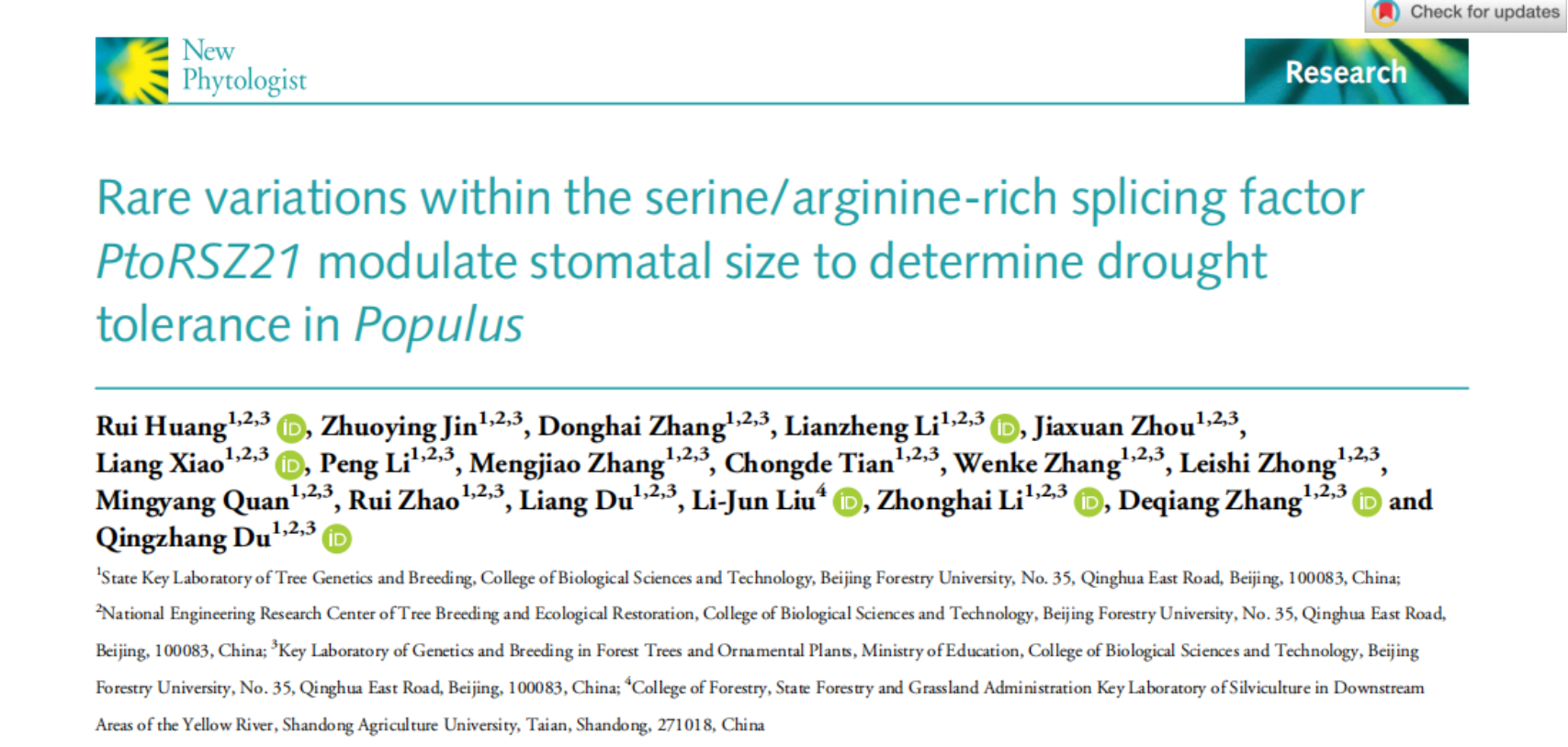 近日,北京林业大学生物科学与技术学院/林木遗传育种全国重点实验室杜庆章教授课题组在New Phytologist(一区,Top期刊)发表了题为“Rare variations within the serine/arginine-rich splicing factor PtoRSZ21 modulate stomatal size to determine drought tolerance in Populus”的研究论文。该研究以全球五种代表性杨树种质群体稀有变异位点(最小等位基因频率MAF<5%)分布特征和遗传规律为基础,组合利用数量遗传学、分子遗传学与分子生物学等系统遗传学研究策略,揭示了PtoRSZ21及其稀有变异位点通过影响选择性剪切参与调控杨树气孔形态和抗旱性的分子机制。研究结果证明了常被忽视的全基因组大规模稀有变异位点是影响复杂性状“遗传性缺失”的重要因素,补充了木本植物稀有变异位点对非生物胁迫反应和选择性剪接影响的研究空白,具有重要的理论应用价值。
