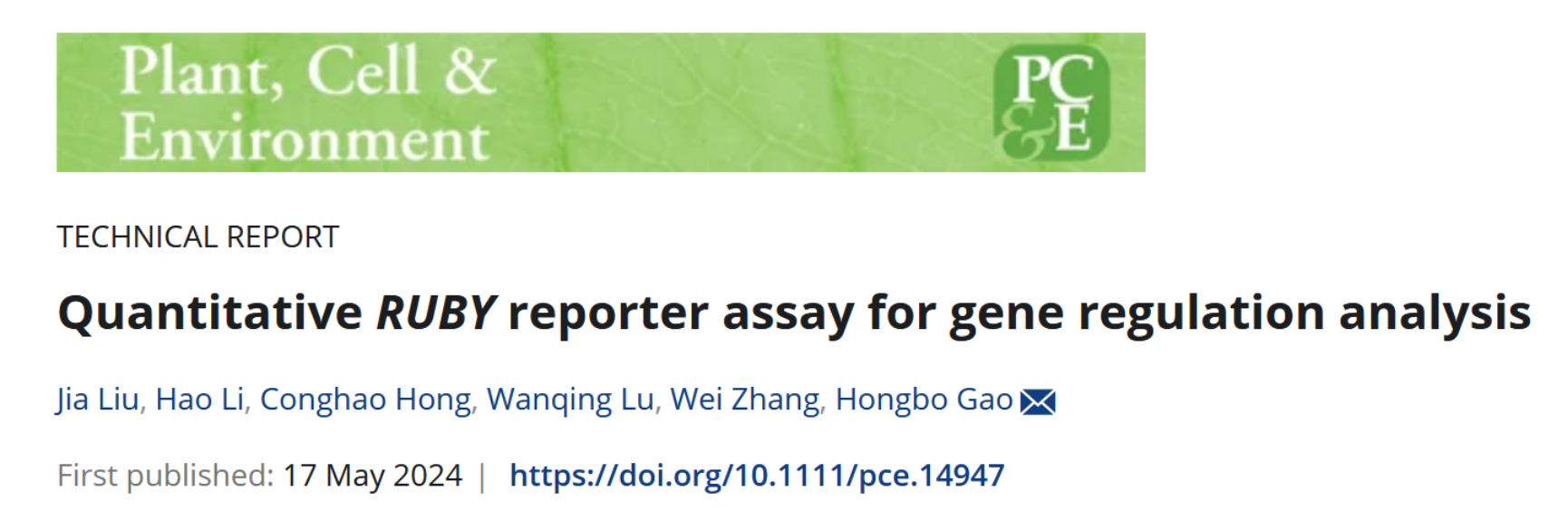 近日,北京林业大学生物科学与技术学院高宏波教授团队在生物学一区TOP期刊《Plant, Cell & Environment》上发表“Quantitative RUBY reporter assay for gene regulation analysis”的研究论文。生物学院博士生刘佳和李好为论文的共同第一作者,高宏波教授为通讯作者,北京林业大学为第一完成单位。