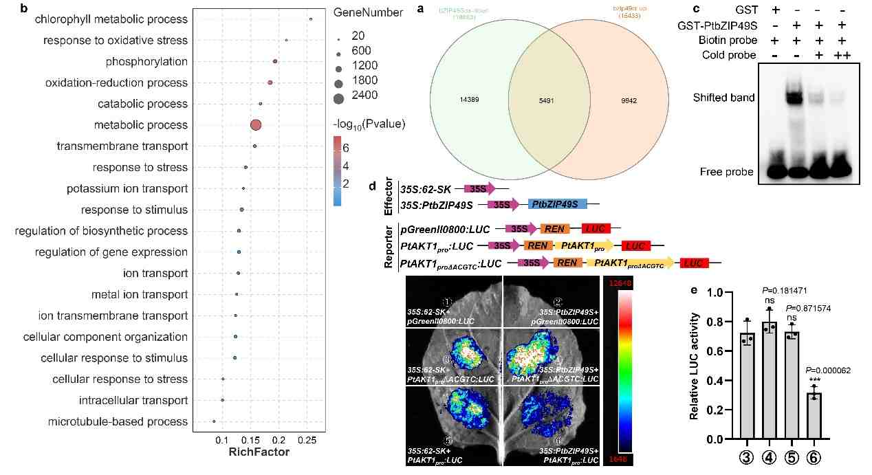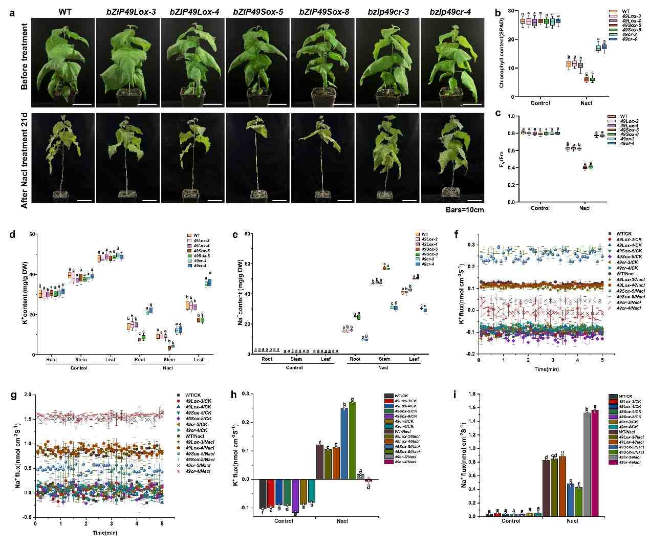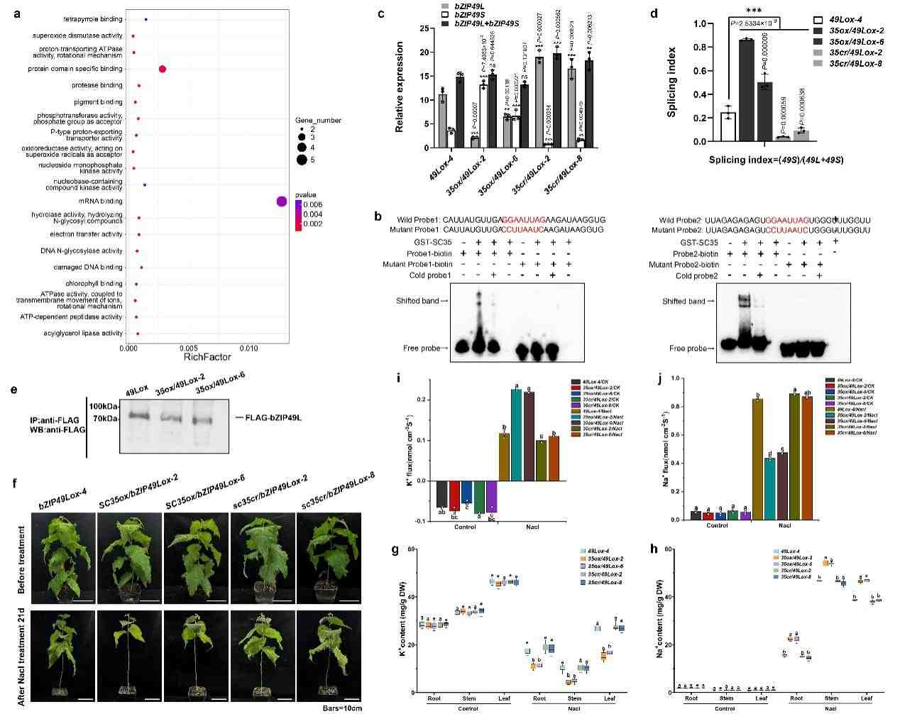 转录因子bZIP49在杨树中通过mRNA剪接产生两种转录本:未剪接型bZIP49L和剪接型bZIP49S。其中,bZIP49S是盐胁迫响应中的主要活性形式,其过表达会导致杨树对盐胁迫更加敏感,并显著抑制K+的吸收;而敲除bZIP49则能增强植株的耐盐性,并提高体内K+的积累水平。