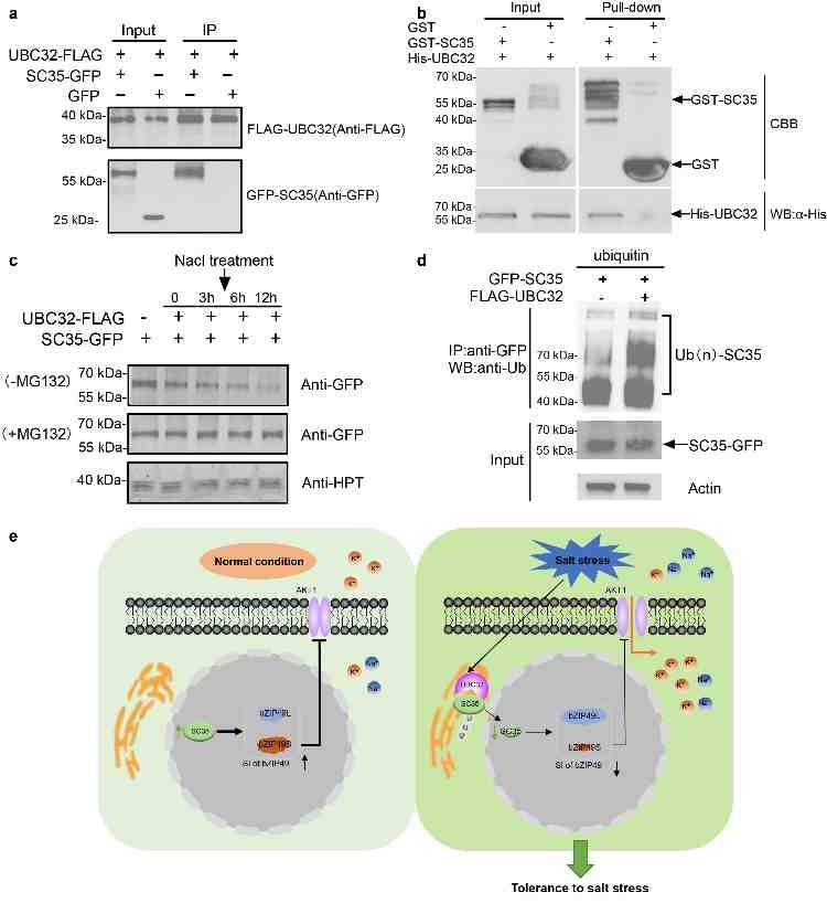 图4 UBC32与SC35相互作用及“UBC32-SC35-bZIP49-AKT1”工作模型