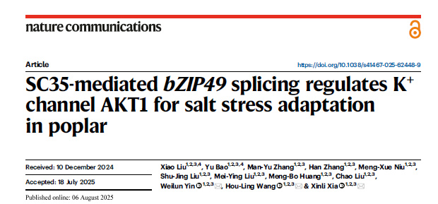 2025年8月6日,北京林业大学生物科学与技术学院/林木遗传育种全国重点实验室尹伟伦院士/夏新莉教授课题组在Nature Communications发表了题为“SC35-mediated bZIP49 splicing regulates K+ channel AKT1 for salt stress adaptation in poplar”的研究论文。研究发现,在毛白杨中,剪接因子SC35可介导bZIP49基因的剪接,产生的剪接体bZIP49S通过调节钾离子转运蛋白AKT1的表达,影响Na⁺/K⁺平衡,从而调节杨树的耐盐能力。