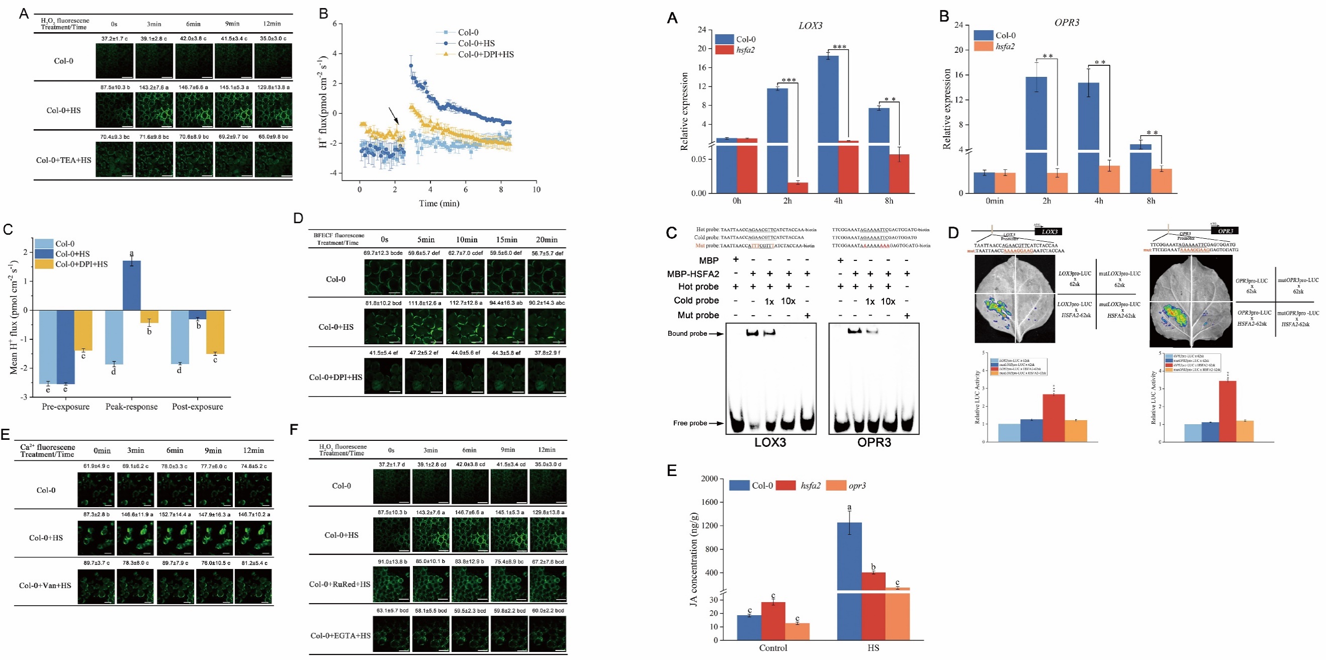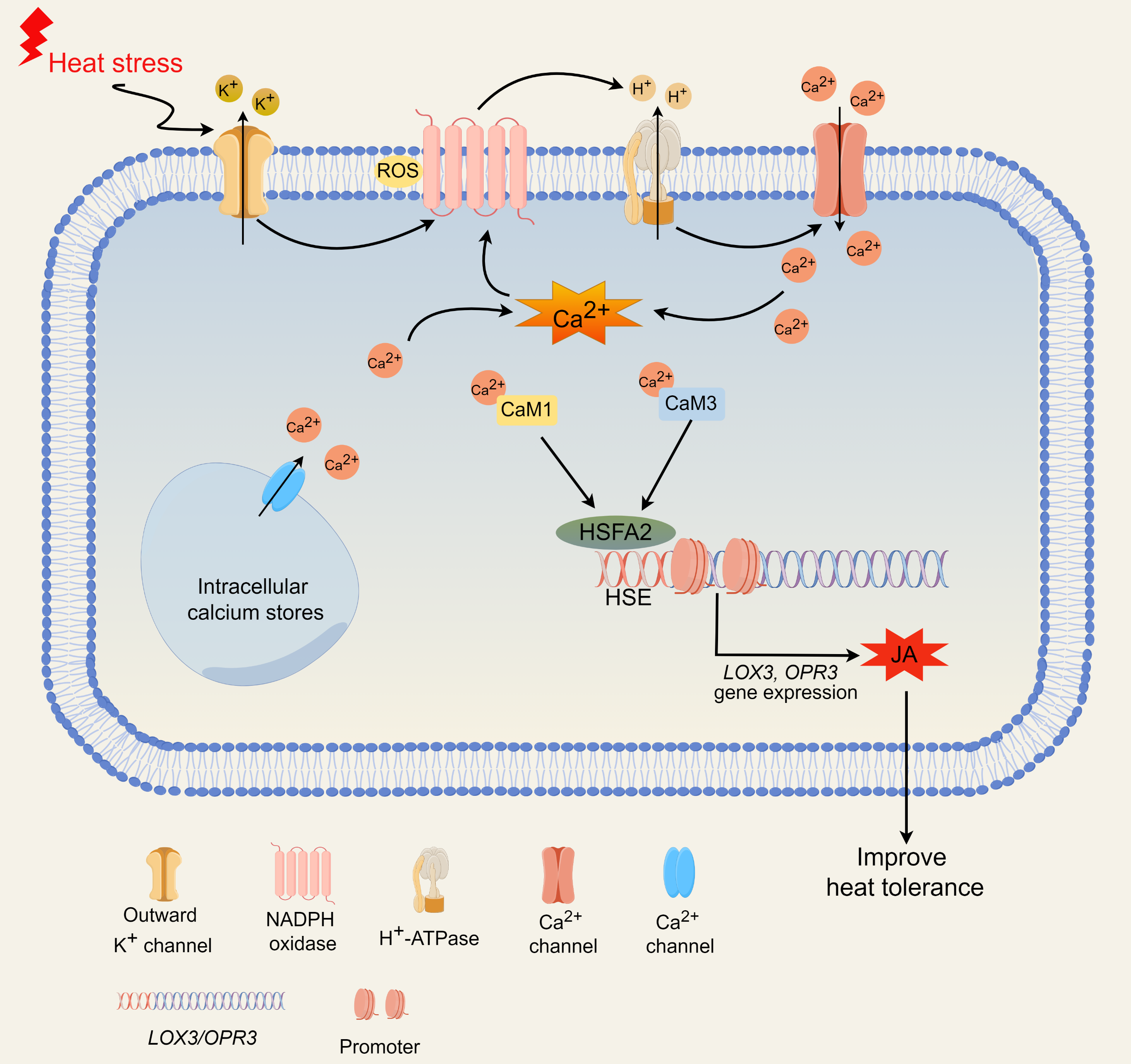 植物遭受热胁迫时,首先被质膜外向K+通道感知,将细胞内的K+转运至细胞外,进而激活质膜NADPH氧化酶RBOHD造成ROS的迸发,再激活质膜H+-ATPase通过消耗ATP将细胞质中的H+排出,引起质膜超极化激活内向钙离子通道,为下游Ca2+流入胞质提供质子驱动力,[Ca2+]cyt的增加则由胞外Ca2+进入胞质和胞内Ca2+的动员和再分配共同完成,反过来,Ca2+也会调节ROS爆发,启动下一轮早期信号事件。钙信号作为第二信使,可与CAM1和CAM3结合并可能通过某种方式影响HSFA2基因的表达。HSFA2作为响应热胁迫的关键转录因子,调控JA合成途径关键酶LOX3、OPR3基因表达,促进JA的合成,降低植物的叶片相对电导率,提高相对含水量和叶绿素含量从而增强拟南芥的耐热性。