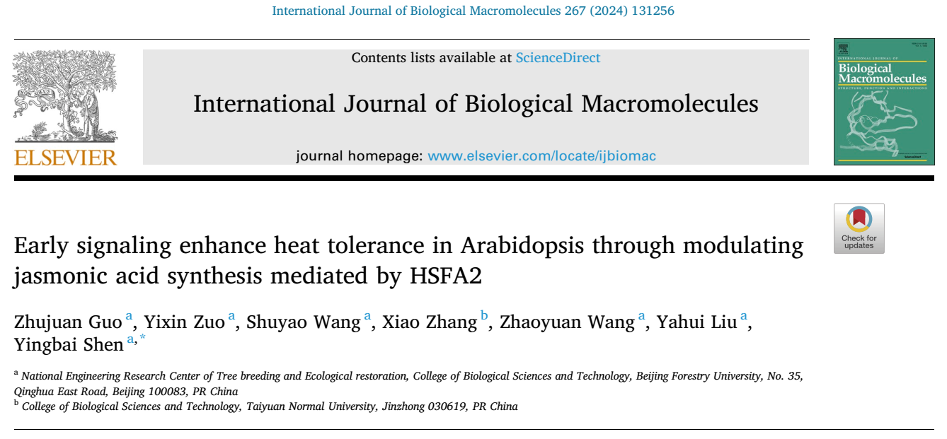 近日,北京林业大学生物科学与技术学院沈应柏教授团队在International Journal of Biological Macromolecules(一区,TOP期刊,IF=8.2)上发表了题为“Early signaling enhance heat tolerance in Arabidopsis through modulating jasmonic acid synthesis mediated by HSFA2”的研究论文。