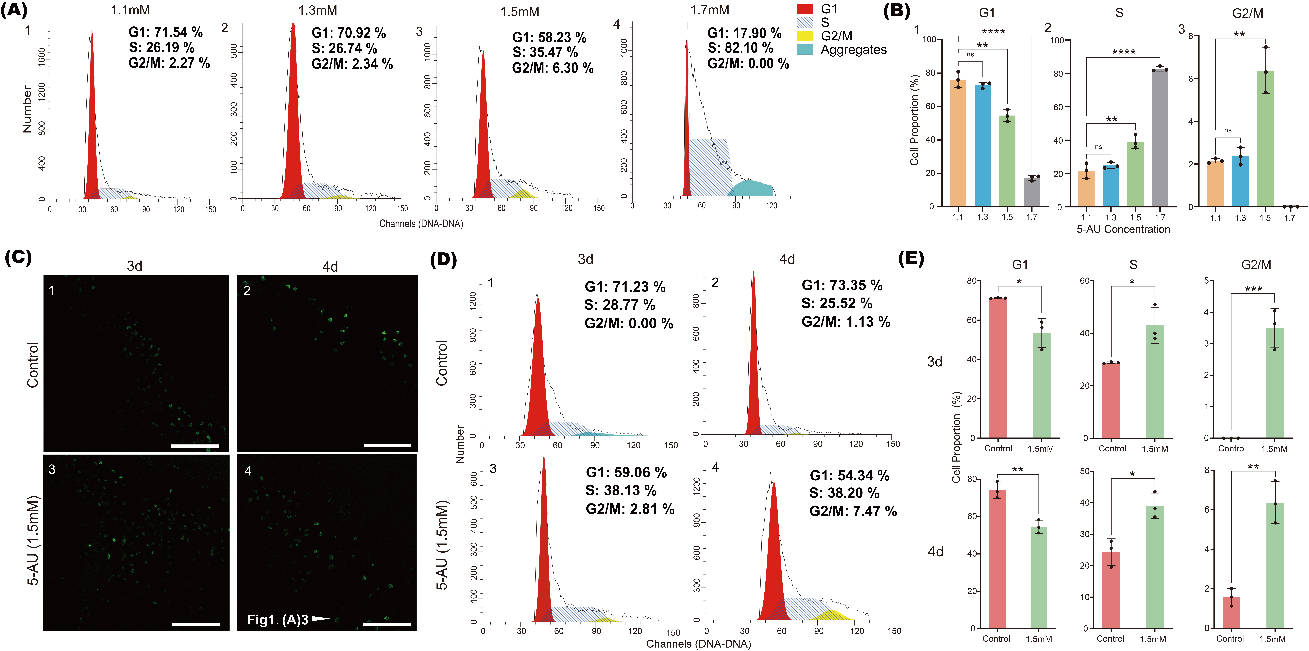 图1. 不同 5-AU 浓度对细胞周期同步化效果的影响(A、B);同对照组相比1.5mM的5-AU处理对细胞周期的影响,EdU荧光标记(C),流式细胞测定(D)与统计(E)