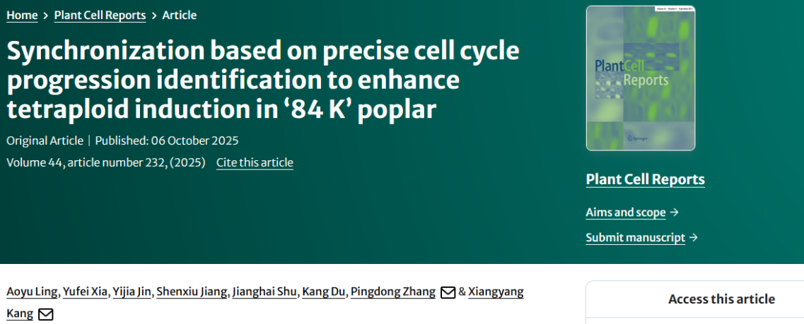 近日,北京林业大学生物科学与技术学院/林木遗传育种全国重点实验室康向阳教授团队以题为 “Synchronization Based on Precise Cell Cycle Progression Identification to Enhance Tetraploid Induction in ‘84K’ Poplar” 于《Plant Cell Reports》杂志发表四倍体高效诱导技术研究论文。该论文提出了一种基于细胞周期同步化处理提高杨树四倍体诱导效率的方法。