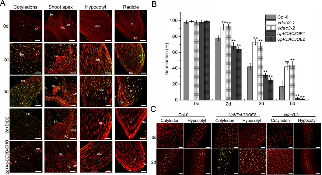 种子老化过程中存在典型的细胞程序性死亡(PCD)现象。其中,活性氧(ROS)引起的线粒体形态功能改变早于其他细胞器发生,是死亡早期的关键事件。电压依赖性阴离子通道(VDAC)是线粒体外膜上最为丰富的跨膜通道蛋白。在动物和植物中,VDAC均是线粒体途径细胞凋亡的重要元件。因此,探明VDAC门控调节机制对于阐述种子老化机理具有十分重要的意义。