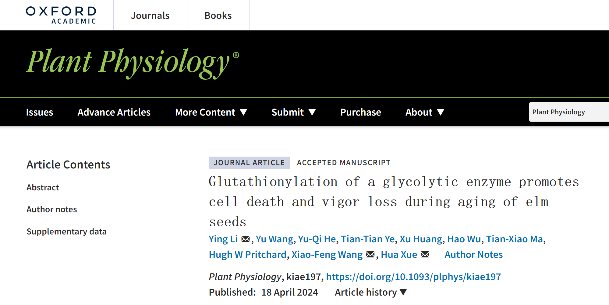 北京林业大学历来十分重视林草种质资源的收集、保存、评价和创制等相关基础和应用研究,在国家林草种质资源设施保存库承建工作中投入了大量力量。近日,林木遗传育种全国重点实验室、生物科学与技术学院种子生物学研究方向薛华副教授课题组在Plant Physiology(一区Top)在线发表了题为Glutathionylation - triggered GAPDH–VDAC interaction promotes PCD-like cell death during elm seed ageing的研究论文,揭示了谷胱甘肽化修饰介导的GAPDH-VDAC蛋白互作调控家榆种子活力和细胞死亡的分子机制。