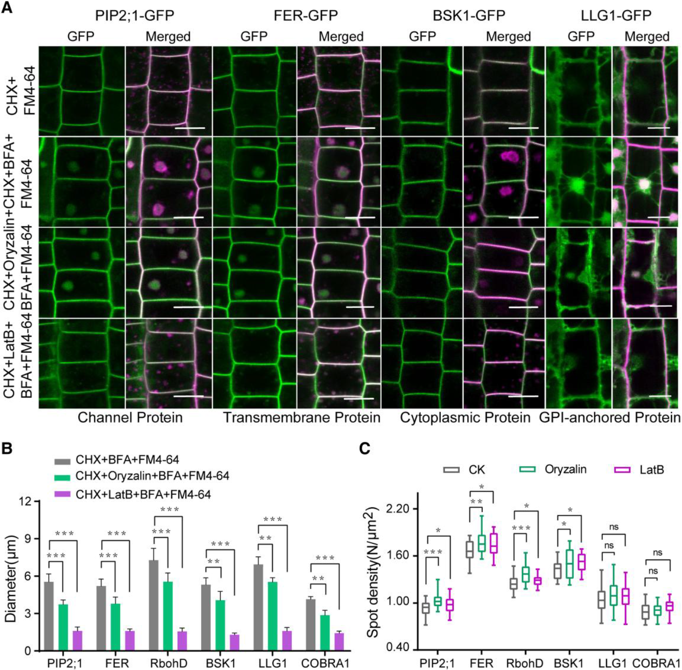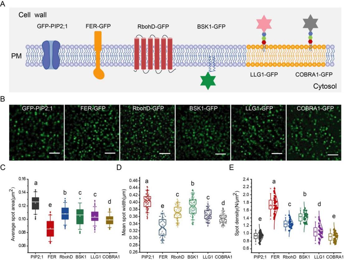 该研究利用单分子技术及细胞生物学方法分析探究三类不同定位的6种PM蛋白的分布模式和动力学行为,发现植物细胞中不同PM蛋白在分布以及动力学上均具有异质性 (图1)。利用药物处理 (Oryzalin或Lat B) 来研究细胞骨架对PM蛋白动力学的影响,结果发现除外膜锚定蛋白外,其余PM蛋白的运动速度在细胞骨架破坏后均显著增加,且Oryzalin处理效果更为明显,说明细胞骨架是限制PM蛋白运动的主要屏障,且微管的限制作用更为显著。
