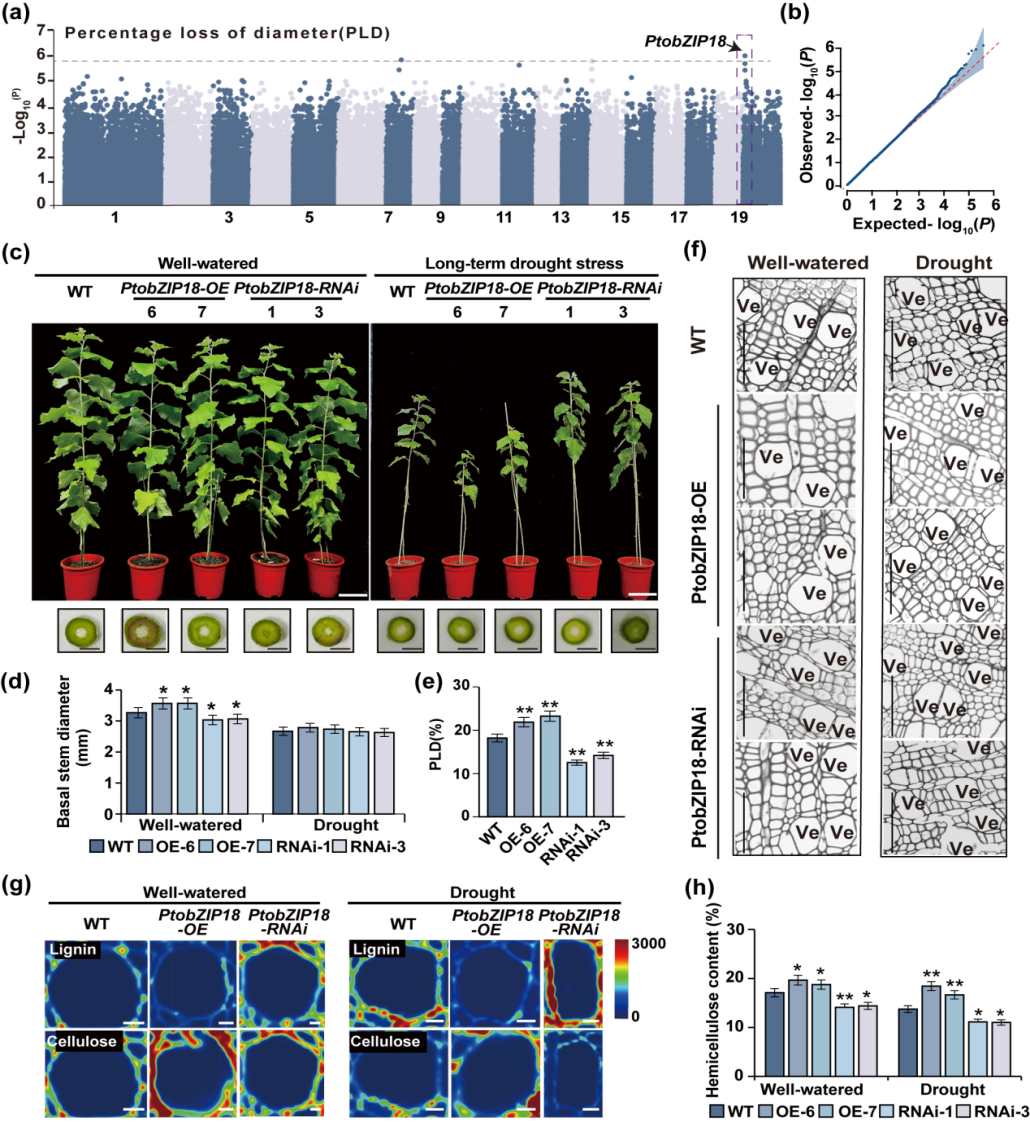 研究表明,干旱胁迫下茎干直径损失百分比(PLD)是反映茎部旱胁迫响应的直观且有效参数,可作为研究干旱影响茎适应性发育的关键指标。基于毛白杨种质群体在干旱胁迫下的PLD表型,研究人员鉴定到协同调控旱胁迫响应与木质部发育的关键基因PtobZIP18(图1a, b)。水分充足条件下,与野生型相比,PtobZIP18过表达(PtobZIP18-OE)株系表现出茎基部直径增大、导管密度降低及导管腔面积显著增加(图1d, f)。细胞壁成分分析显示,其木质素含量显著降低,而纤维素和半纤维素水平升高(图1g, h)。然而,在干旱胁迫下,这些在水分充足时促进生长的结构特征(如大导管腔)和成分变化(低木质素),却导致PtobZIP18-OE植株的茎部水分传导率、茎水势和相对含水量(RWC)均显著低于野生型;相反,PtobZIP18敲低(PtobZIP18-RNAi)植株则呈现相反表型。这表明,PtobZIP18过表达虽能促进水分充足条件下的茎干生长,但其诱导的木质部结构(如导管稀疏)和细胞壁成分(如低木质素)在干旱下更易发生栓塞,损害水分运输与保水能力,最终显著降低植株抗旱性。