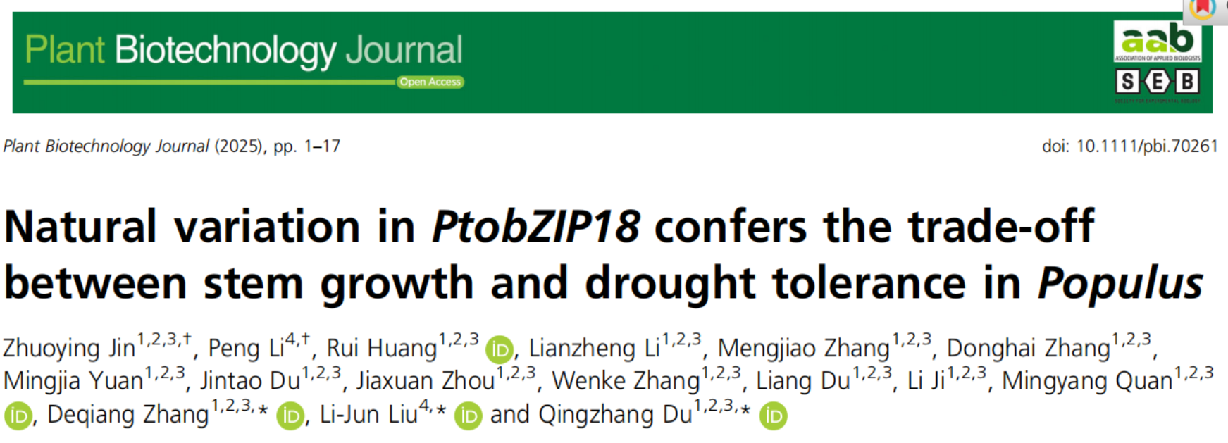 该研究整合群体遗传学与分子生物学等系统遗传学策略,揭示了杨树响应干旱胁迫与木质部发育的平衡调控机制,发现 PtobZIP18自然变异通过重塑木质部导管结构与细胞壁组分,显著提升水分运输效率,从而增强干旱适应性。这一发现为林木生长-抗旱协同优化育种奠定了重要理论基础。