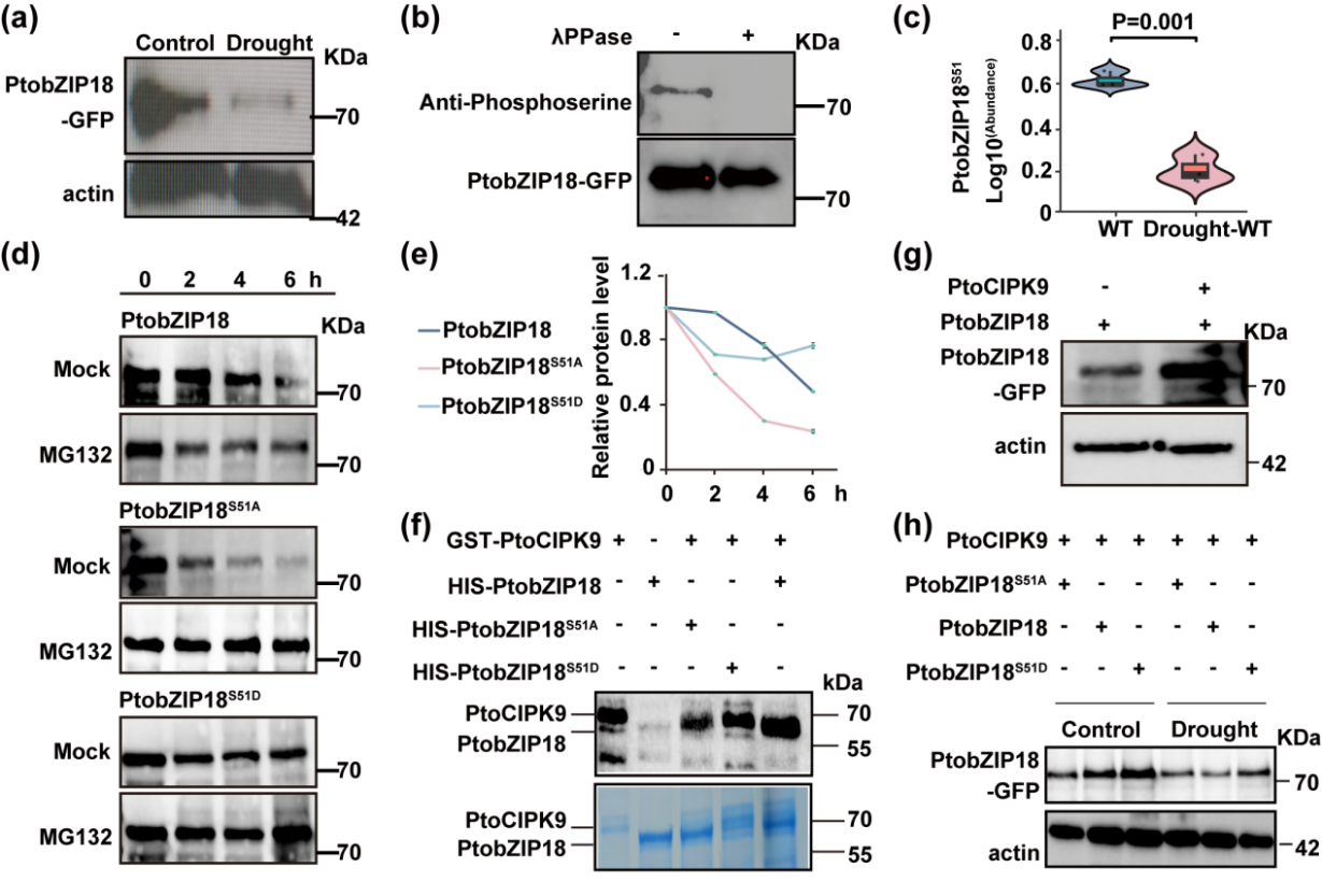 体外磷酸化实验鉴定出PtoCIPK9激酶可直接磷酸化PtobZIP18蛋白。为验证其在植物中的功能,在烟草叶片中瞬时同时表达PtobZIP18与PtoCIPK9蛋白。在正常水分下,PtoCIPK9表达能维持PtobZIP18磷酸化水平并延缓其降解;然而,干旱胁迫(2小时内)破坏了PtoCIPK9介导的PtobZIP18磷酸化,导致PtobZIP18蛋白迅速降解(图 4f-h)。研究表明,干旱通过干扰PtoCIPK9对PtobZIP18 Ser51磷酸化修饰,从而降低其蛋白稳定性。