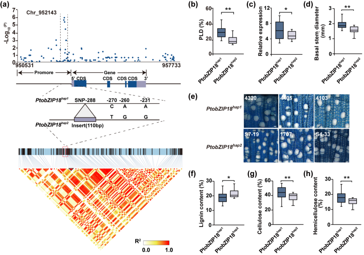 群体遗传学分析揭示,PtobZIP18启动子区域存在一个特定单体型(包含一个110 bp的SV结构变异和3个SNP突变),其中PtobZIP18hap1单倍型与更强的生长潜力相关,而PtobZIP18hap2与更高的导管密度和木质素含量相关(图 2a, d和f)。两种单倍型地理分布频率显示,PtobZIP18hap1主要分布于湿润的南部气候区,而PtobZIP18hap2等位基因主要分布于干旱的西北气候区。这种单体型频率随气候梯度变化的格局,为PtobZIP18单体型变异驱动毛白杨气候适应性提供了直接的群体遗传学证据。