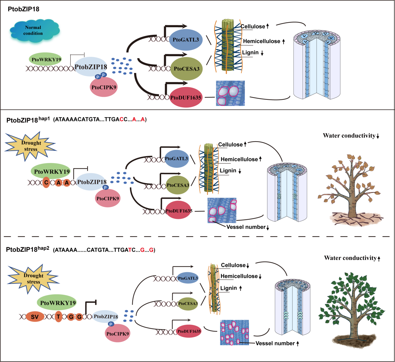 本研究阐明了PtobZIP18及其启动子自然变异(Hap1/Hap2)平衡调控杨树生长与抗旱的分子机制。在正常水分条件下,PtoWRKY19抑制PtobZIP18转录,但PtobZIP18蛋白仍通过激活下游靶基因PtoGATL3、PtoCESA3和PtoDUF1635促进茎干生长。当遭遇干旱胁迫时,双重调控机制显著降低PtobZIP18蛋白水平:一方面,干旱削弱PtoCIPK9激酶活性,导致其减少对PtobZIP18蛋白Ser51位点磷酸化修饰而加速其降解;另一方面,干旱诱导的PtoWRKY19进一步抑制PtobZIP18转录水平。自然变异在此过程中起关键作用:PtobZIP18hap2启动子因结构变异(SV)和单核苷酸多态性(SNP)导致其基础转录活性显著低于PtobZIP18hap1。在干旱胁迫下,这种固有的低转录活性与 PtoWRKY19 介导的诱导抑制相结合,导致PtobZIP18hap2单倍型中PtobZIP18表达量急剧下降,调控PtoGATL3/PtoCESA3/PtoDUF1635表达同步受抑。表型分析表明,PtobZIP18hap2单倍型木质部纤维素与半纤维素含量合成降低,木质素沉积增强,导管密度增高且单个导管管腔直径减小,显著提升了干旱胁迫下的水分运输效率,促使资源分配向抗旱适应性倾斜,揭示了自然变异通过调控核心转录因子实现生长-生存权衡的分子机制。