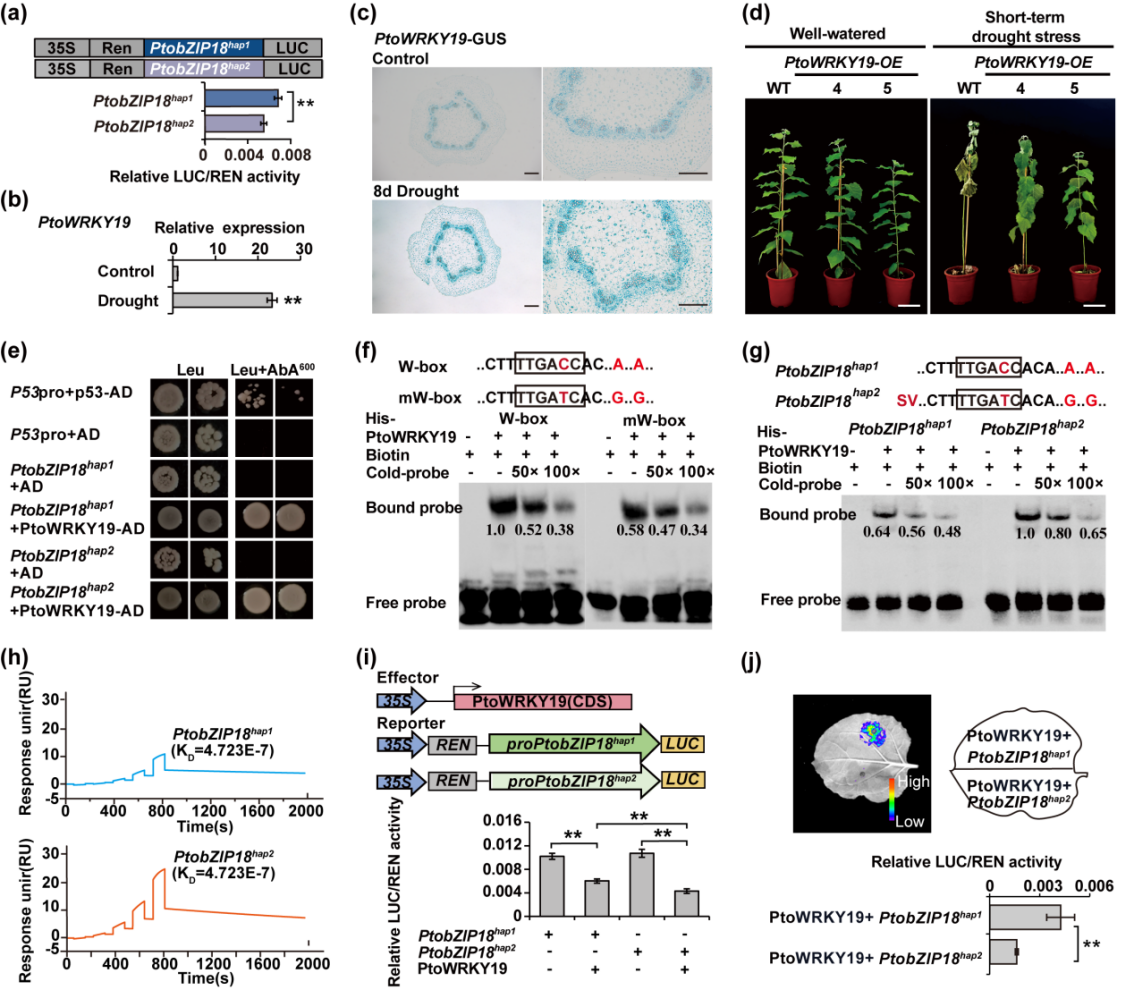 为阐明PtobZIP18自然变异的调控机制,通过整合其启动子序列变异、长期干旱胁迫转录组数据及组织特异性表达谱,筛选并鉴定出其上游调控因子—PtoWRKY19。RT-qPCR 与 GUS 组织染色证实,PtoWRKY19在杨树木质部中特异表达,且其表达在干旱胁迫下的茎部显著上调(图 3b, c),表明其主要在茎干响应水分亏缺过程中发挥功能。短期干旱胁迫实验表明,过表达PtoWRKY19的转基因株系存活率显著提高,证明PtoWRKY19是干旱耐受性的正调控因子 (图 3d)。分子实验进一步揭示,PtobZIP18启动子的单倍型变异显著影响转录因子PtoWRKY19对其启动子的结合亲和力:PtoWRKY19对PtobZIP18hap2启动子序列表现出更强的结合能力(图 3e-g)。鉴于PtoWRKY19是PtobZIP18转录活性的抑制因子,其对PtobZIP18hap2启动子更强的结合能力直接导致了对PtobZIP18基因表达的更强抑制作用。