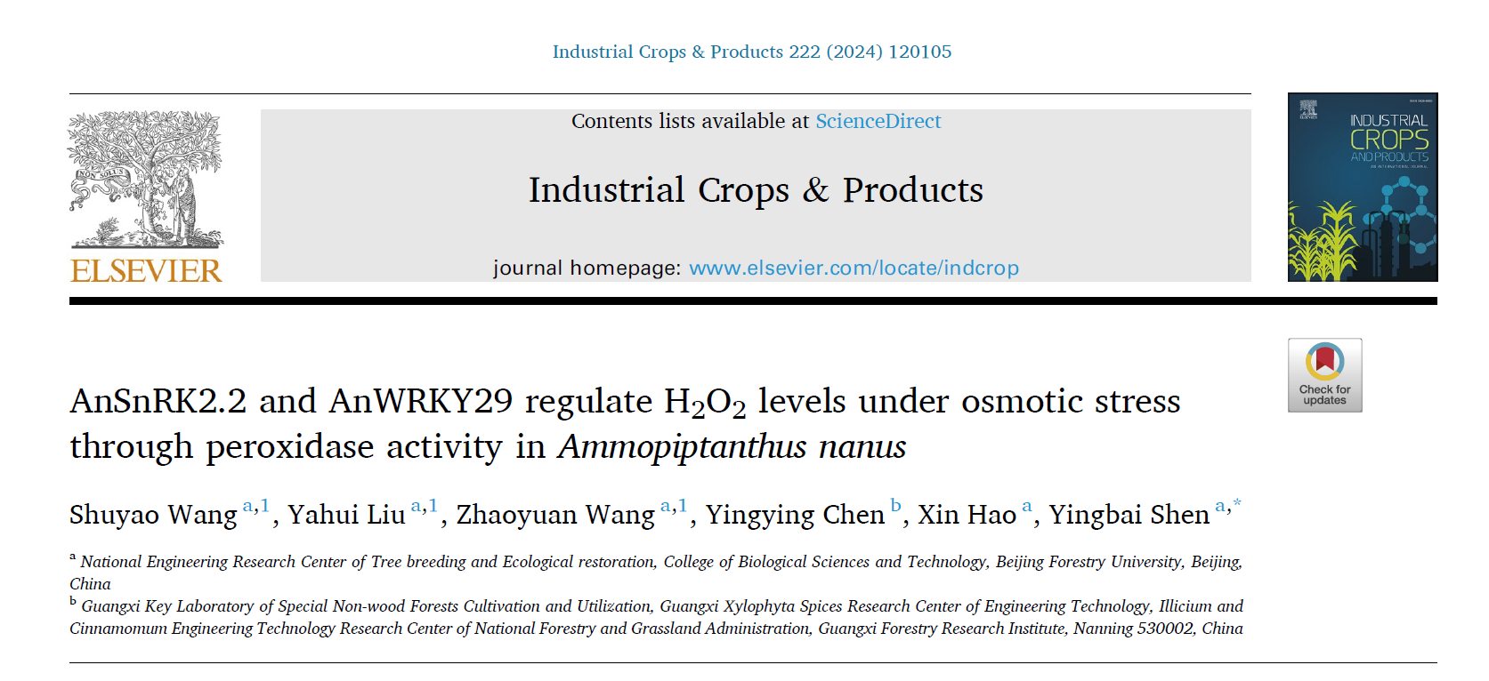 近日,我院沈应柏教授团队在《INDUSTRIAL CROPS AND PRODUCTS》(中国科学院一区TOP)上发表了题为“AnSnRK2.2 and AnWRKY29 regulate H2O2 levels under osmotic stress through peroxidase activity in Ammopiptanthus nanus”的研究论文。研究揭示了新疆沙冬青(Ammopiptanthus nanus)通过增强植株内过氧化氢(H2O2)的清除机制,从而增强了其对渗透胁迫的耐受性。此项工作能够对新疆沙冬青的保护和恢复,以及对植物适应逆境的研究产生积极贡献。