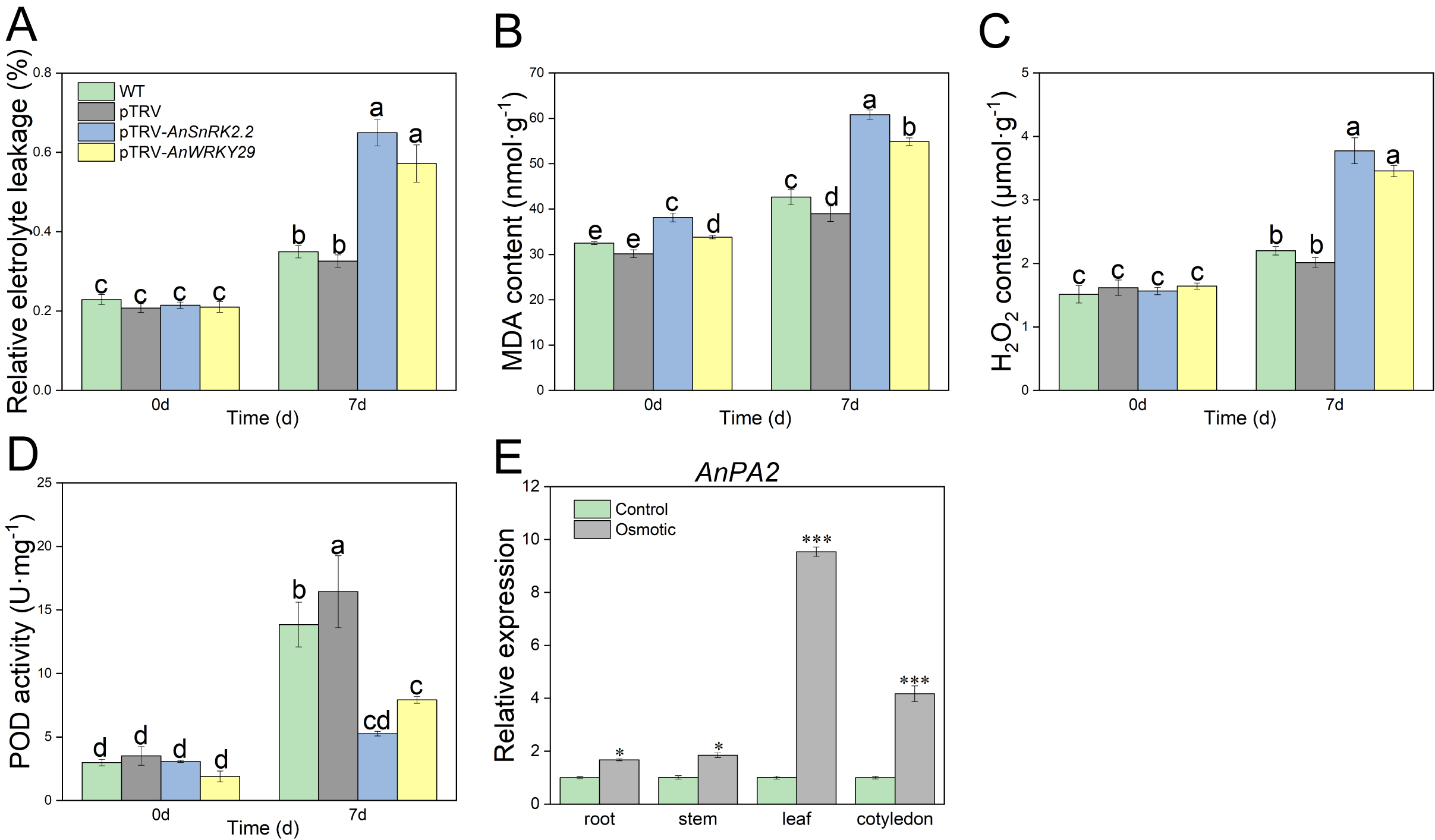 新疆沙冬青,豆科植物,是第三纪常绿阔叶林的孑遗物种。因其在经济和药用方面的多重价值,新疆沙冬青受到了广泛关注。其果实和叶片富含多种生物活性成分,包括维生素、抗氧化剂和必需脂肪酸。这些成分在传统医学中用于治疗各种疾病,如消化系统问题、皮肤病和呼吸系统疾病。严重的干旱胁迫(年降水量<200<>毫米)显著限制了新疆沙冬青的保护和繁殖,对荒漠生态系统的生态恢复产生了深远的不利影响。鉴于增强抗氧化能力对新疆沙冬青的生存和繁衍至关重要,该研究揭示了新疆沙冬青在渗透胁迫条件下的适应机制,重点在于阐明丝氨酸/苏氨酸蛋白激酶AnSnRK2.2和WRKY转录因子家族成员AnWRKY29在调节新疆沙冬青渗透胁迫抗性中的作用。
