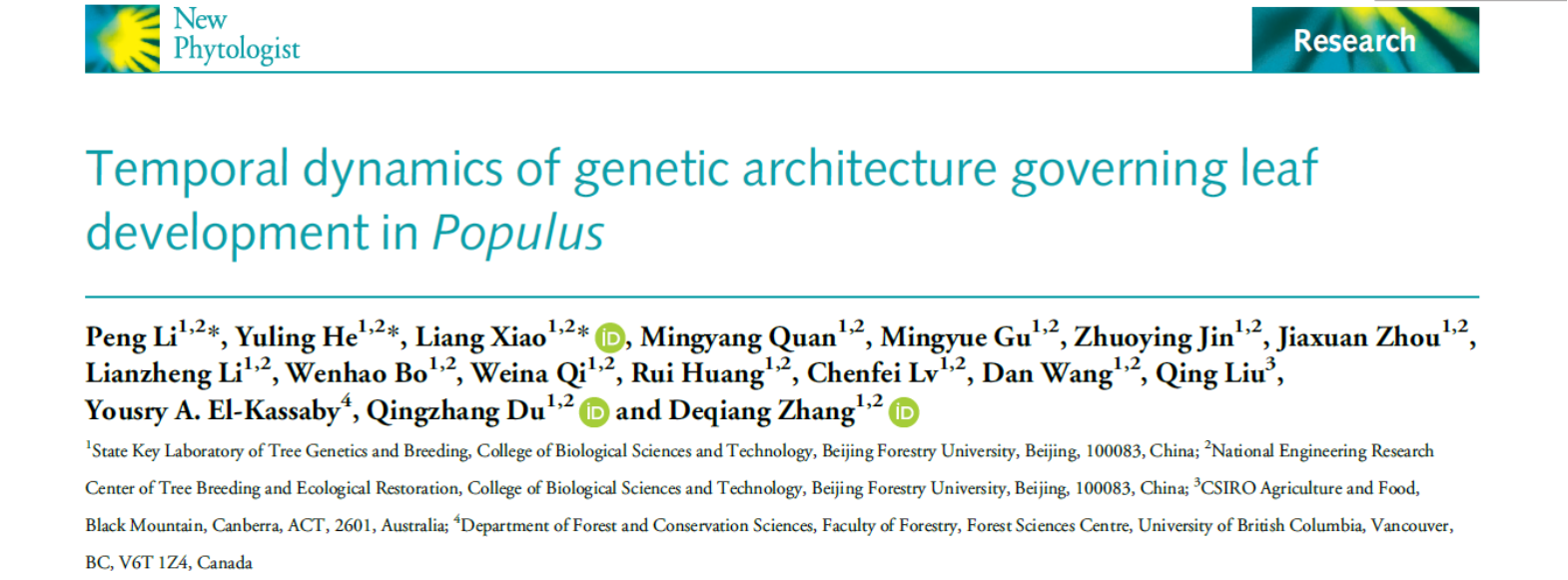 近日,北京林业大学生物科学与技术学院张德强教授课题组在New Phytologist(一区,Top期刊)发表的题为“Temporal dynamics of genetic architecture governing leaf development in Populus”的研究论文。该研究通过引入叶片发育的时间维度表型数据开展动态全基因组关联分析,系统解析了杨树叶片发育的遗传调控机制。研究结果不仅填补了多年生林木叶片发育遗传基础不清的空白,也为突破性林木良种选育提供关键理论指导。