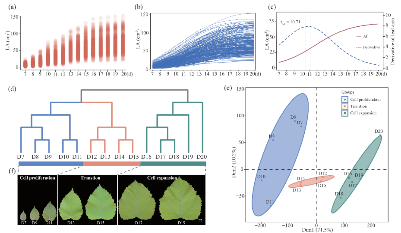 叶片是植物光合作用的主要场所,也是探索植物器官发育机理良好模式。前人研究表明,叶片发育是细胞增值与扩张协同作用的多阶段连续过程,因此,系统解析发育过程的遗传基础,揭示关键调控基因动态参与不同阶段的分子机理,是深入理解叶片发育机制的关键。研究人员以一年生毛白杨种质资源群体为材料,连续追踪叶片在14个发育时间点的动态变化,并通过回归模型拟合发育轨迹,精准捕获生长速率变化等叶片发育的典型特征。进一步联合叶片14个发育时间点样本的转录组聚类结果与细胞学形态分析发现,杨树叶片发育可分为细胞增殖、细胞增殖向扩张转变和细胞扩张三个阶段,其叶片发育曲线的变化与发育阶段的转变高度一致(图1)。