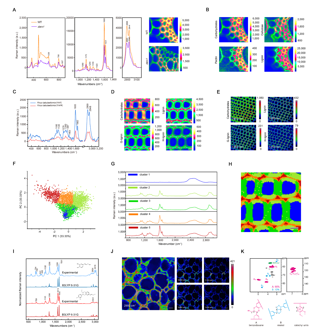 SCIENCE CHINA Life Sciences近日在线发表了北京林业大学生物科学与技术学院林金星团队题为“Single-cell characterization of major components of plant cell walls in situ by Raman spectroscopy”的研究论文。该研究以油松、水稻和麻风树等为材料,采用拉曼光谱技术包括共聚焦拉曼显微(Confocal Raman microscopy,CRM)以及受激拉曼散射(Stimulated Raman scattering,SRS)显微成像在单细胞水平上对细胞壁不同层次主要成分的含量和分布进行了原位检测。论文对一类新型木质素:C型木质素进行了实验测定以及密度泛函理论(Density-functional theory,DFT)计算,预测得到了C型木质素单体和二聚体的标准拉曼光谱并确定与苯环伸缩振动有关且具有强烈拉曼信号的1135 cm-1峰为C型木质素特征拉曼峰,同时在麻风树种皮中采用SRS确定了细胞壁不同层次中各类木质素单体的相对含量以及沉积分布规律。研究进一步采用主成分分析和聚类分析等方法对光谱数据进行优化分类,结果表明拉曼成像与聚类结果具有良好的相关性。综上所述,拉曼光谱技术可提供成分检测和原位成像,通过算法分析对光谱数据进行优化,这在大规模快速检测多种细胞壁成分方面具有显著优势。基于已建立的拉曼光谱检测与数据分析方法,对于准确提供多种成分的光谱信息,进而实现单细胞水平的原位非破坏性表征提供了新的可能性。