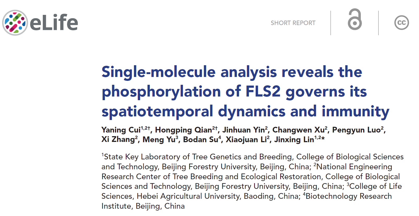 近日,北京林业大学林金星教授团队在eLife发表了题为“Single-molecule analysis unveils the phosphorylation of FLS2 regulates its spatiotemporal dynamics and immunity”的研究论文。该研究运用了活细胞内蛋白分子的标记和实时动态观察技术,深入探索了磷酸化对细胞质膜上FLS2蛋白的动态性质、寡聚化状态、胞吞及其调控机制的影响。研究团队通过精密的实验设计,揭示了磷酸化修饰在调控FLS2与BAK1异源二聚体进入膜筏微区过程中的关键作用,进而影响植物免疫的新机制。这一发现不仅丰富了我们对植物免疫调控网络的认识,也为未来相关领域的研究提供了新的思路和方向。