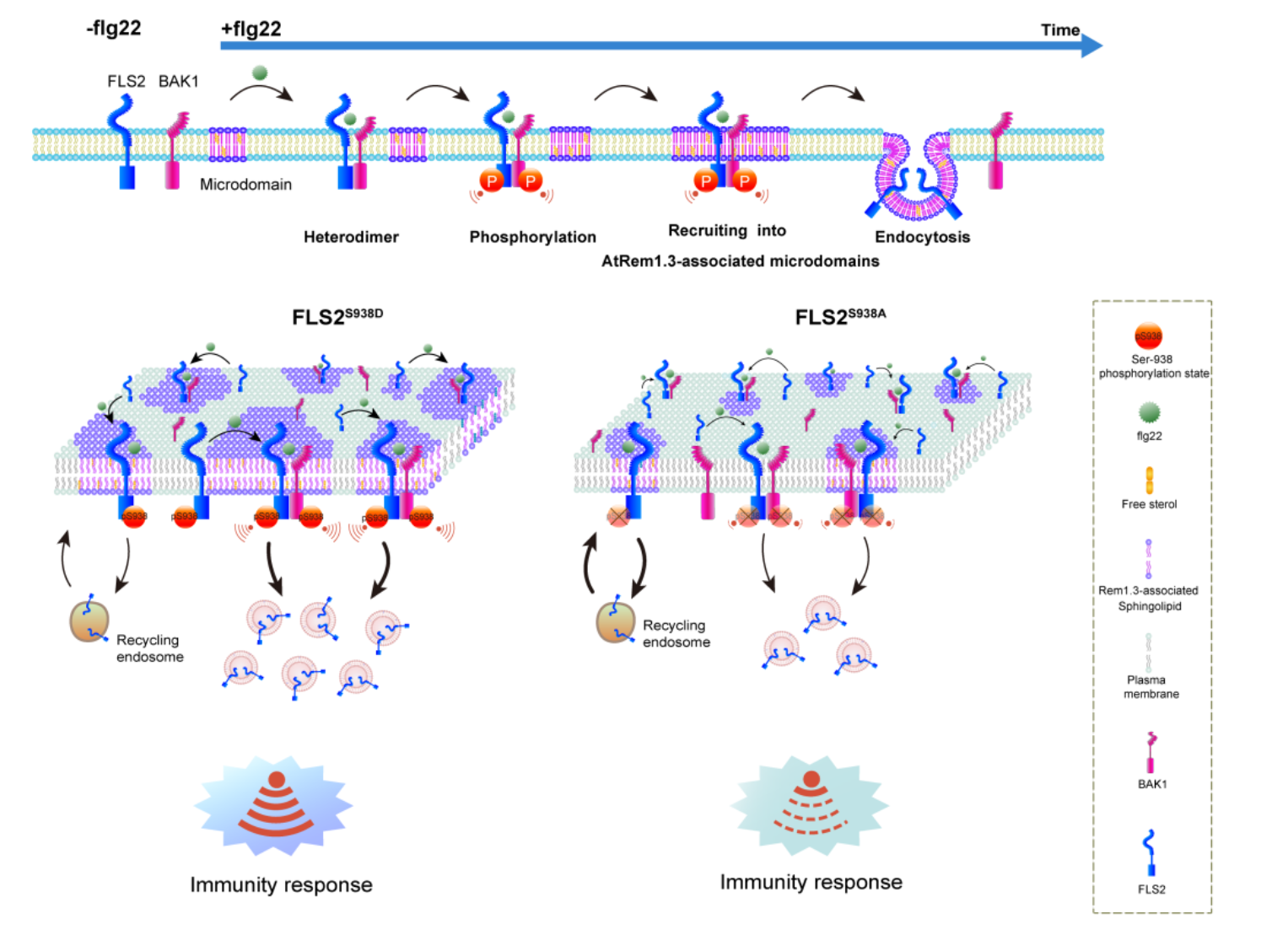 细胞膜上受体激酶 (RKs) 的磷酸化修饰在植物先天免疫反应中扮演关键角色。拟南芥Flagellin-sensing 2 (FLS2) 作为典型的RK,能识别鞭毛蛋白N端22 个氨基酸的保守区域 (flg22),从而启动植物第一道防御反应途径。前人研究已鉴定出FLS2的多个磷酸化位点,并发现Serine-938磷酸化位点在FLS2的功能调控中发挥重要作用。虽然Serine-938磷酸化位点的重要性已得到证实,但是该位点如何通过调节FLS2的时空分布特性进而影响其免疫反应的具体机制,目前仍不清楚。
