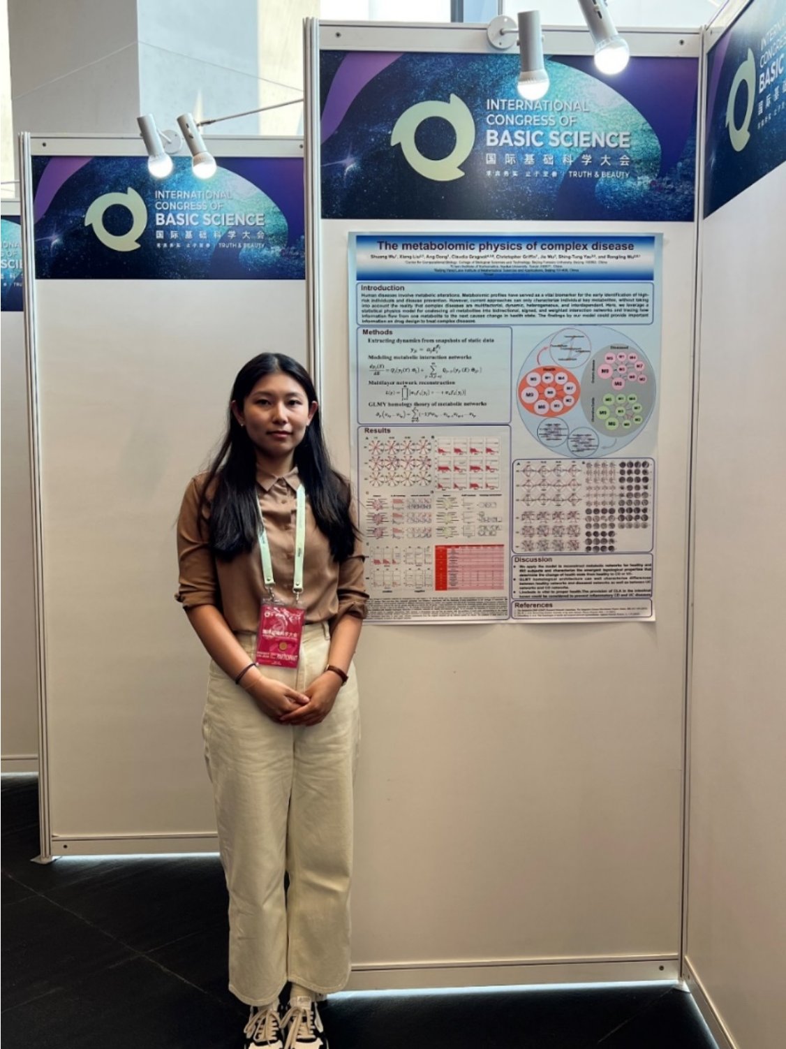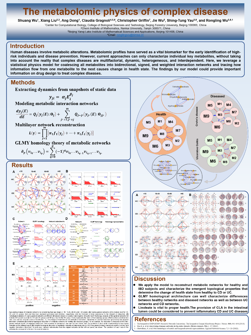 吴双同学的学术论文海报由邬荣领老师指导,内容为《复杂疾病的代谢物理模型》。人类疾病涉及复杂的代谢改变,代谢物已成为早期识别高危个体和疾病预防的重要生物标志物。然而,目前的研究方法只能表征单个关键代谢物,而没有考虑到复杂疾病是多因素的、动态的、异质性的和相互作用的现实。这项工作利用统计物理模型将所有代谢物整合成双向、有符号和加权的交互网络,并追踪从一种代谢物到另一种代谢物的信息流,以及这种信息的流动如何导致健康状态的变化。将疾病的发生视为代谢物之间复杂相互作用的结果,整合了生态位理论和进化博弈论的概念,通过建模来解析一个健康状态中的代谢物是如何通过自身表达和其他代谢物影响而重塑的。这里将自身独立成分作为节点,将代谢物间的互作关系作为边编码到定量网络中,并应用GLMY同源理论来分析和解释健康状态从共生到失调的拓扑变化。该模型在真实数据中的应用能够识别到几种中枢代谢物及其相互作用网络,它们在炎症性肠病的形成中发挥了关键作用。该模型的研究结果可以为治疗这些疾病及其他疾病的药物设计提供重要信息。