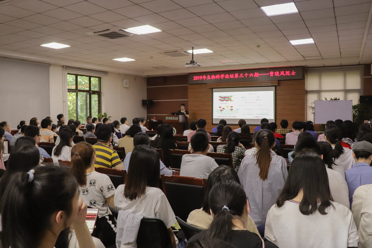 2019年9月11日下午,中国科学院院士、发展中国家科学院院士,中国科学院遗传与发育生物学研究所曹晓风研究员应邀为我校师生做题为“高等植物表观遗传调控机理及应用”的精彩报告。来自生物学院、园林学院等百余名师生参加了学术报告会,报告由生物学院院长林金星教授主持。