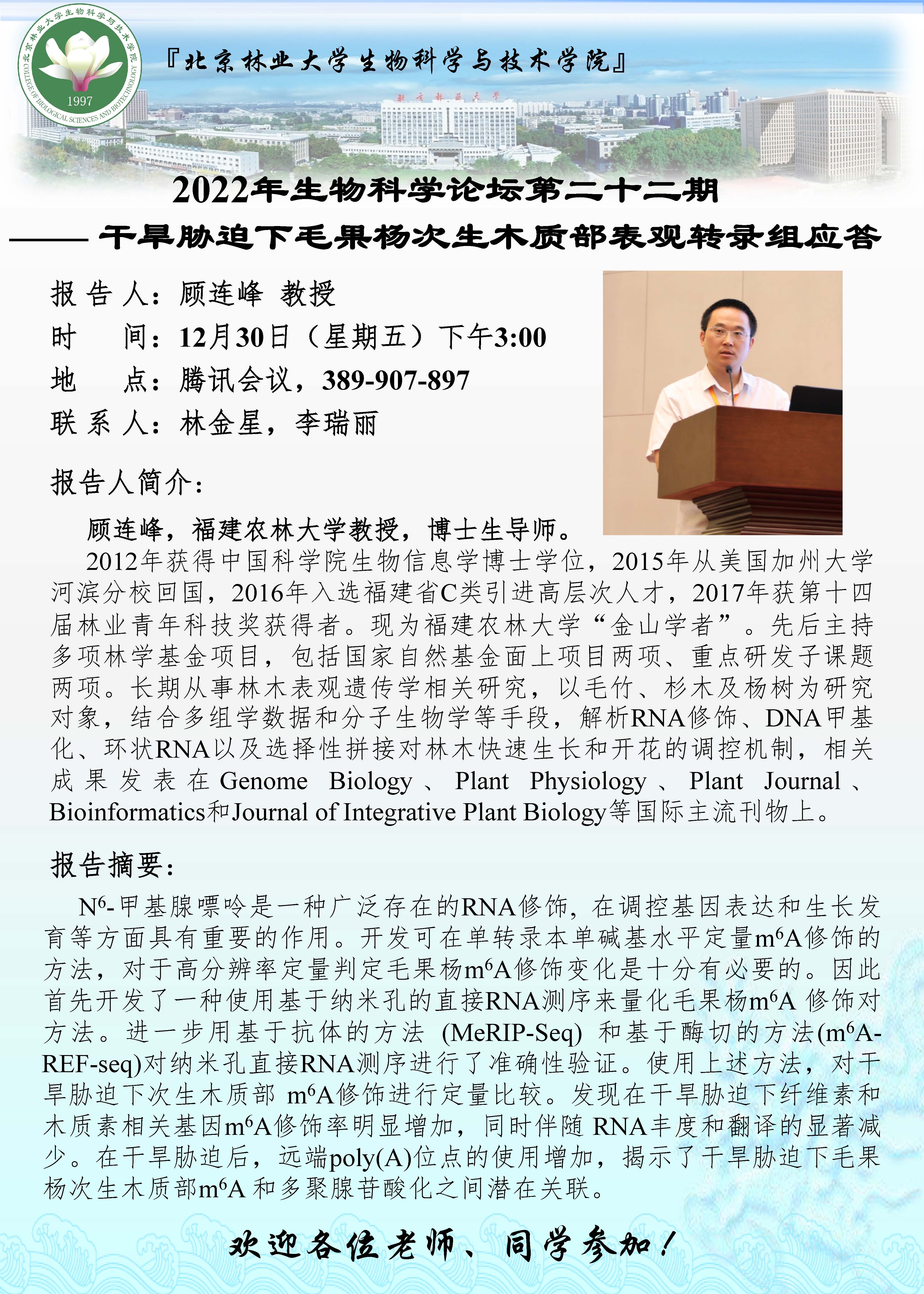 2022年生物科学论坛第二十二期——干旱胁迫下毛果杨次生木质部表观转录组应答