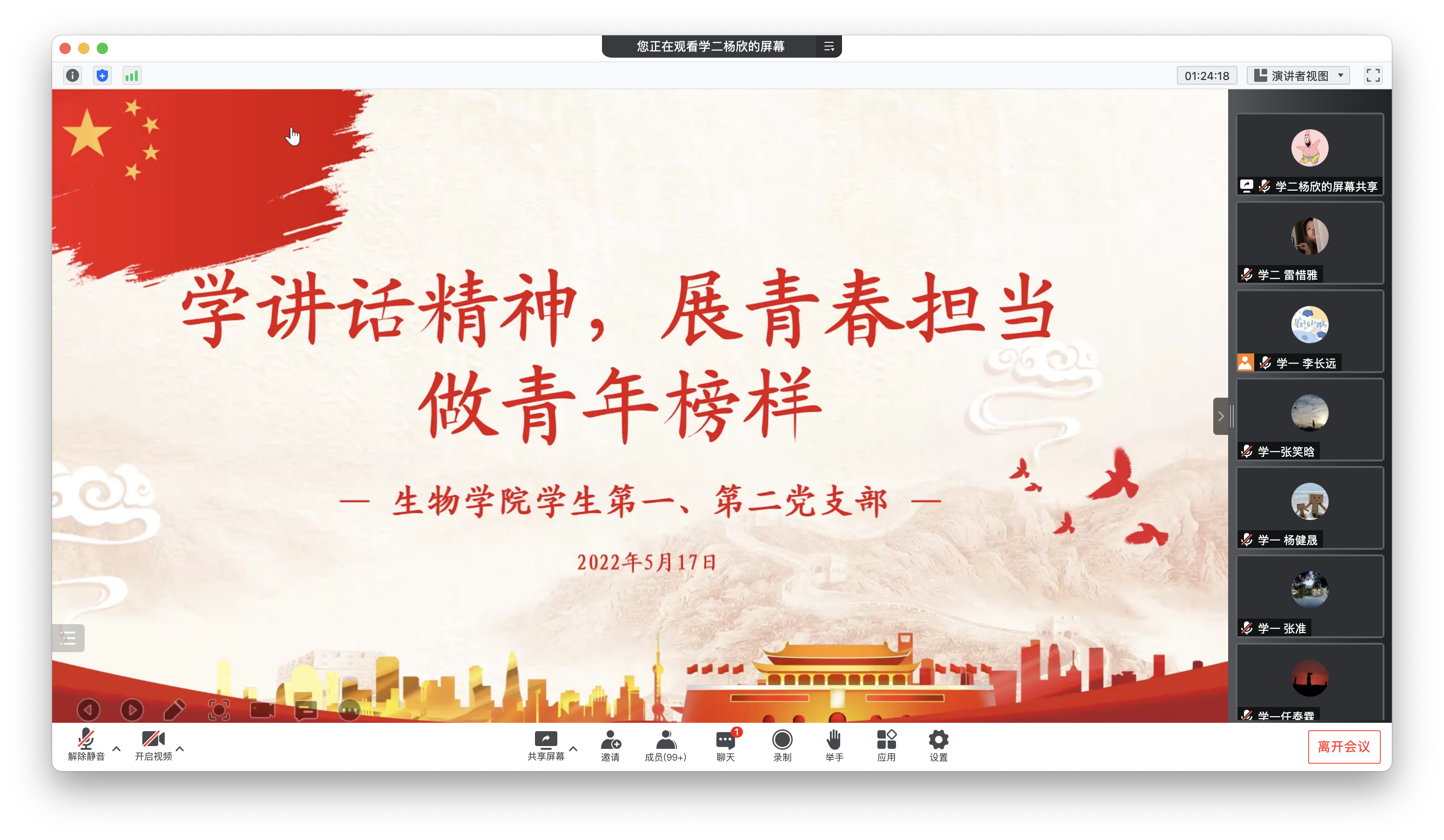 会议上,学生第二党支部的杨欣同志结合5月5日中共中央政治局常务委员会召开的分析当前新冠肺炎疫情防控形势,研究部署抓紧抓实疫情防控重点工作的会议,分享了主题课程《筑堡垒,做先锋,当榜样》。提醒支部同志决不能躺平,要“站”起来,积极支持响应国家的防疫政策;要行动起来,坚定必胜信念,扛起防控责任;要积极践行入党誓词,做一个在“平常时候看得出来,关键时刻站得出来,危难关头豁得出来”的优秀党员!
