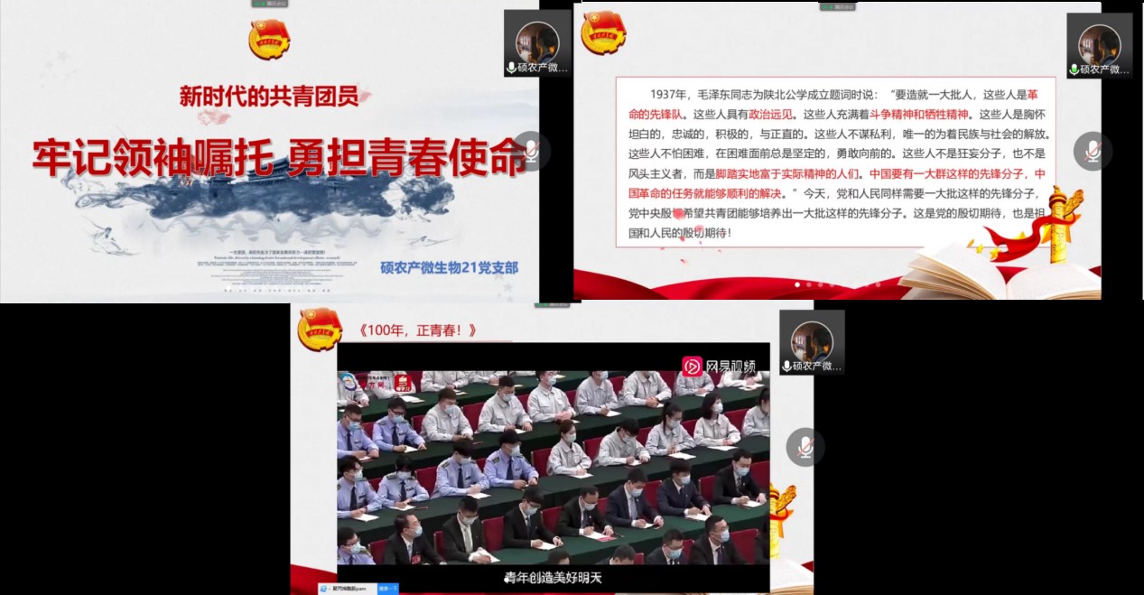 2022年5月15日,硕农产微生物21党支部协硕食品加工与安全21党支部共同开展了一次组织生活,专题学习领会习近平总书记在庆祝中国共产主义青年团成立100周年大会上讲话精神与疫情防控工作精神。